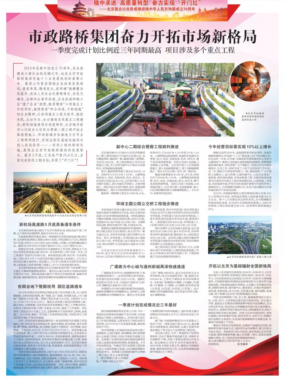 新机场高速项目进展顺利、北京城市副中心行政办公区综合管廊二期工程开始主体结构施工、环球影城京哈高速立交节点工程顺利进行、世园会园区基础设施项目进入收尾阶段……一项项工程的顺利实施,展现出悟空体育推荐 强劲的发展势头。截至3月底,集团公司已完成产值25.4亿元,全面完成阶段工期目标,实现了“开门红”!