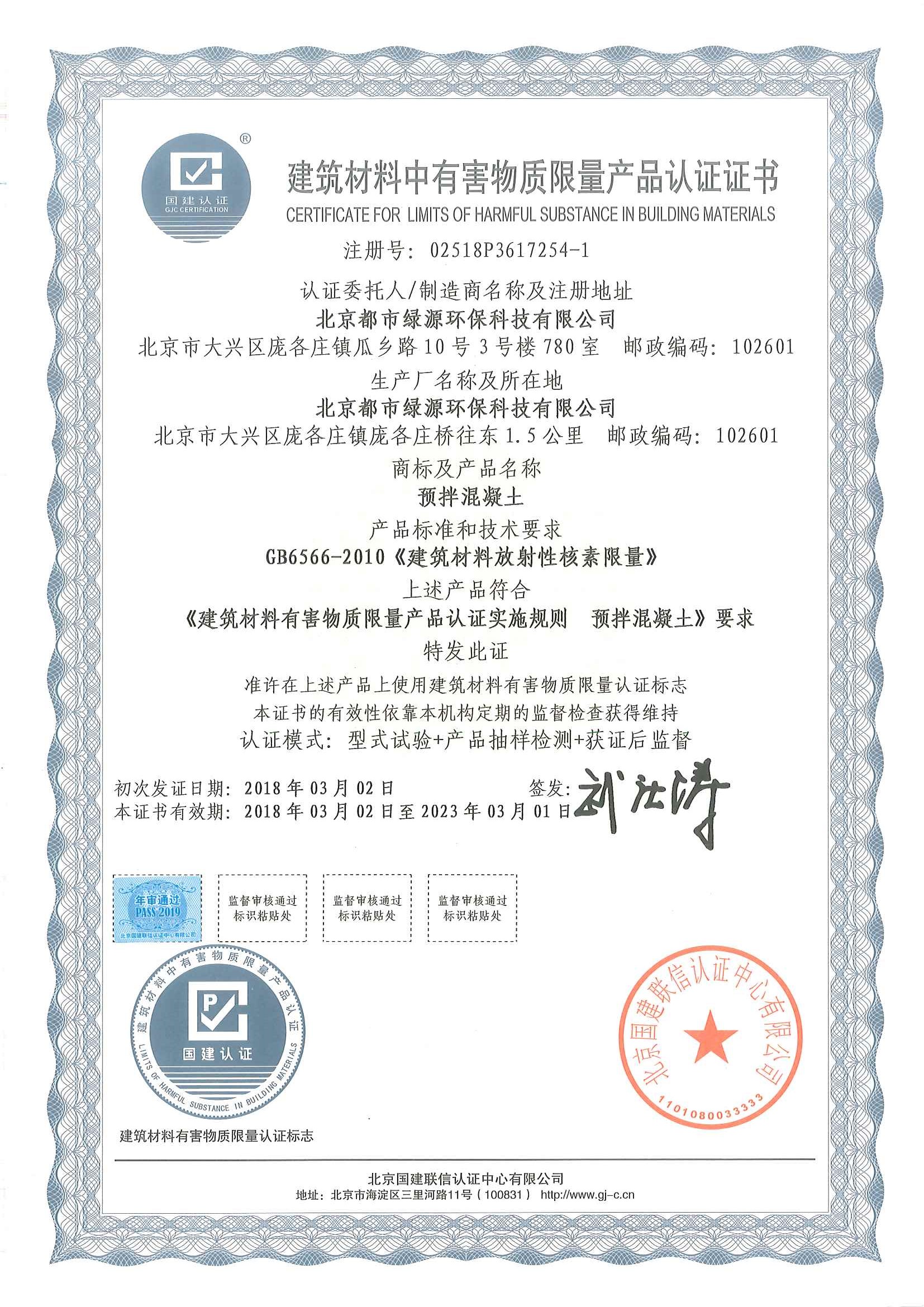 建筑材料中有害物质限量产品认证证书