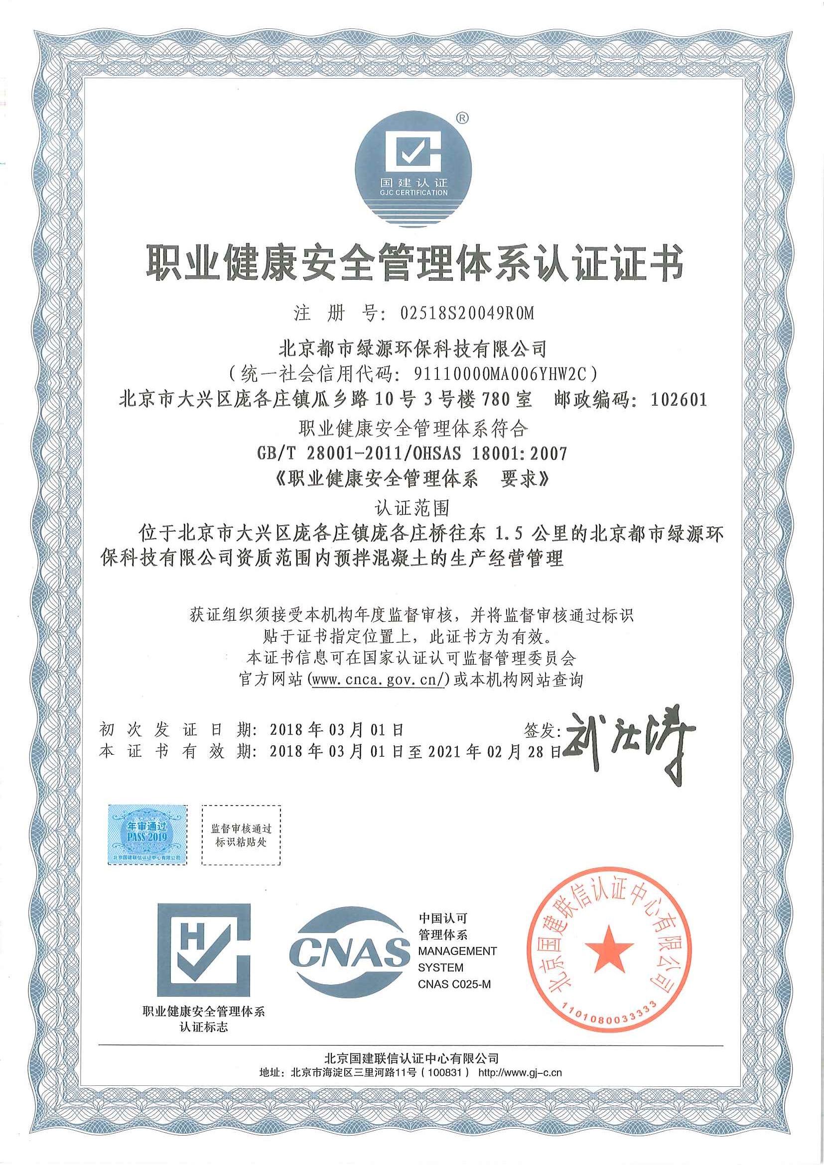 职业健康安全管理体系认证证书