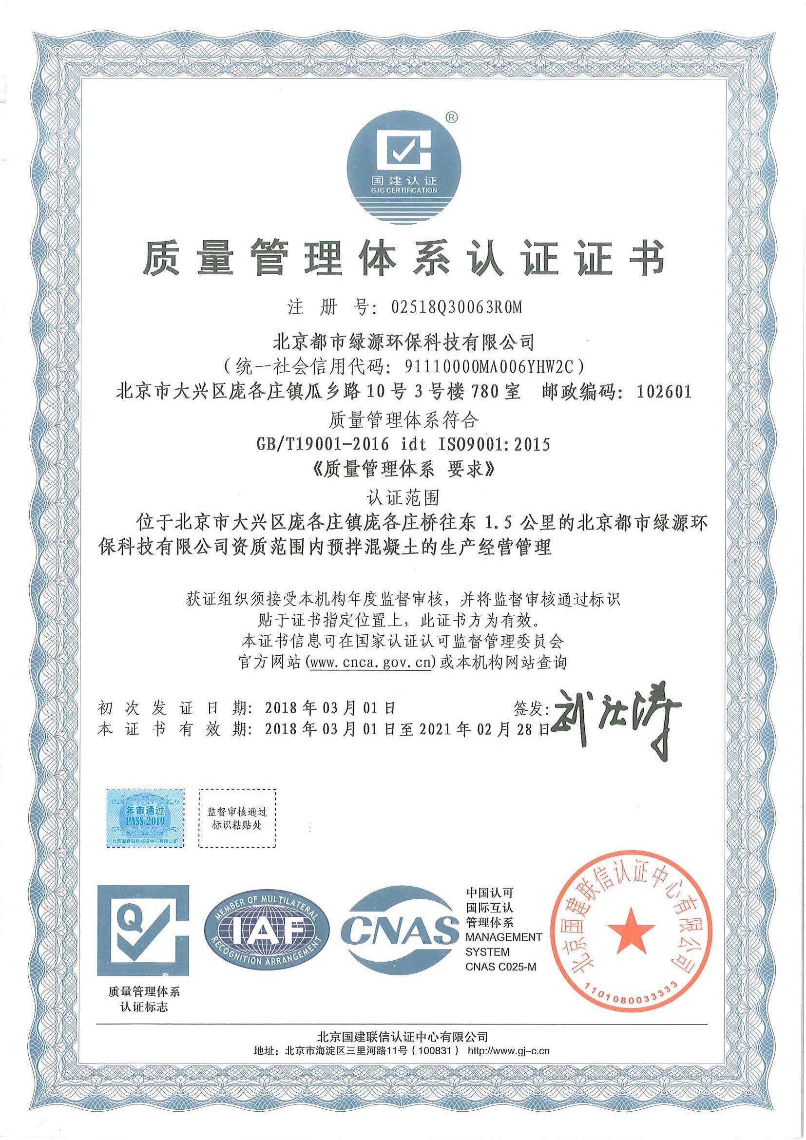 质量管理体系认证证书