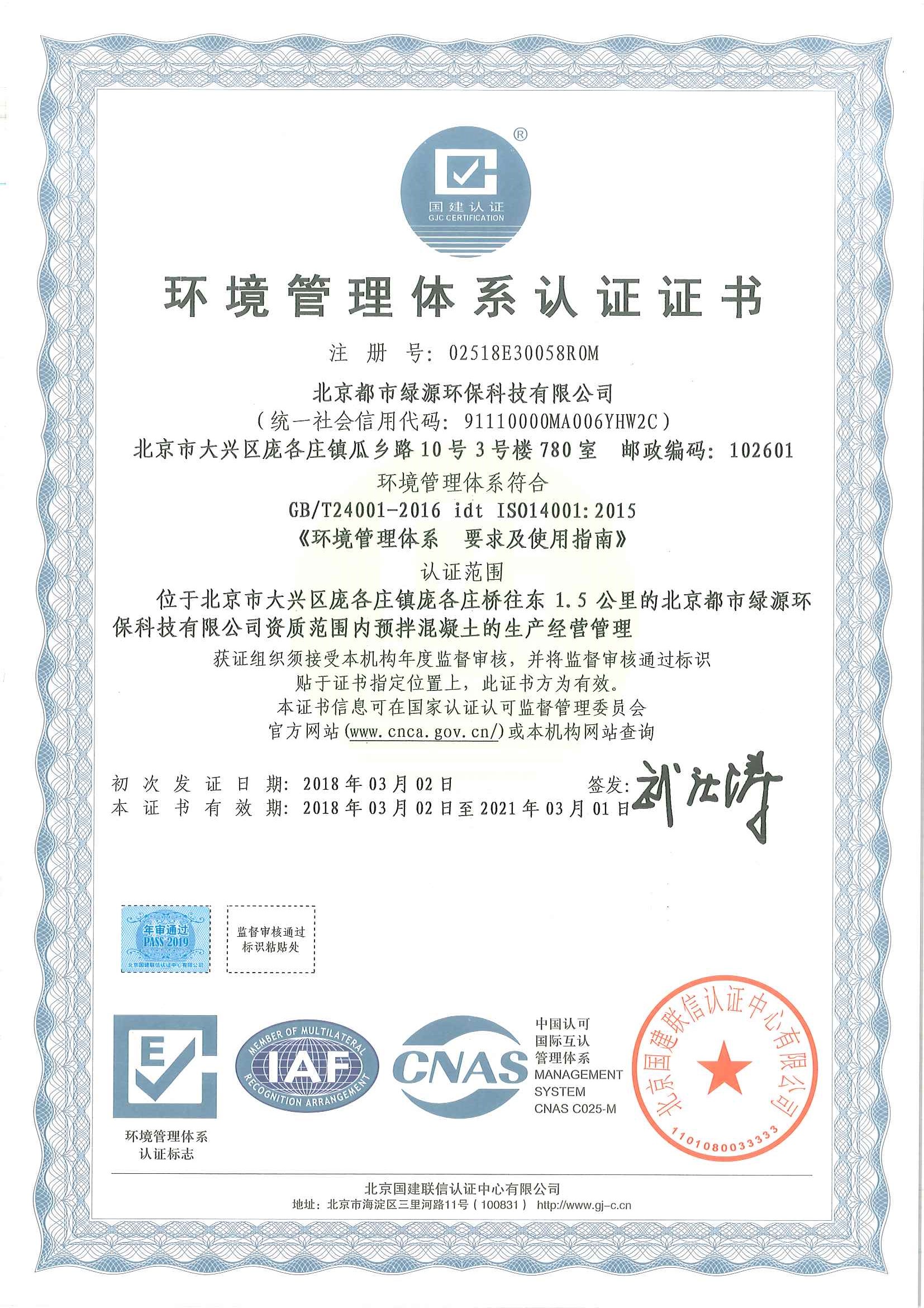 环境管理体系认证证书