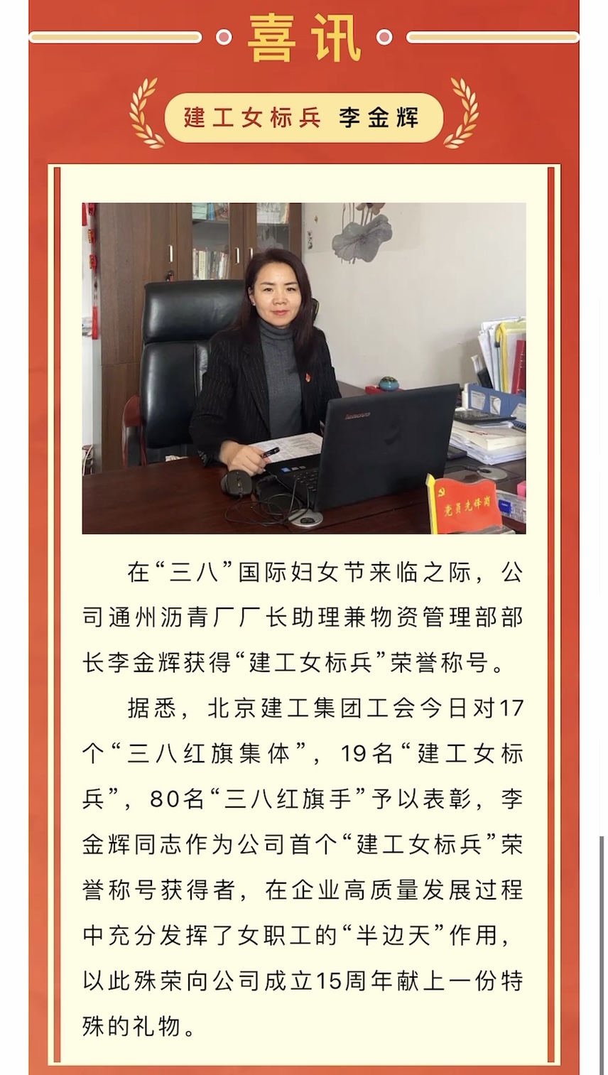 榜样!李金辉获“建工女标兵”荣誉称号