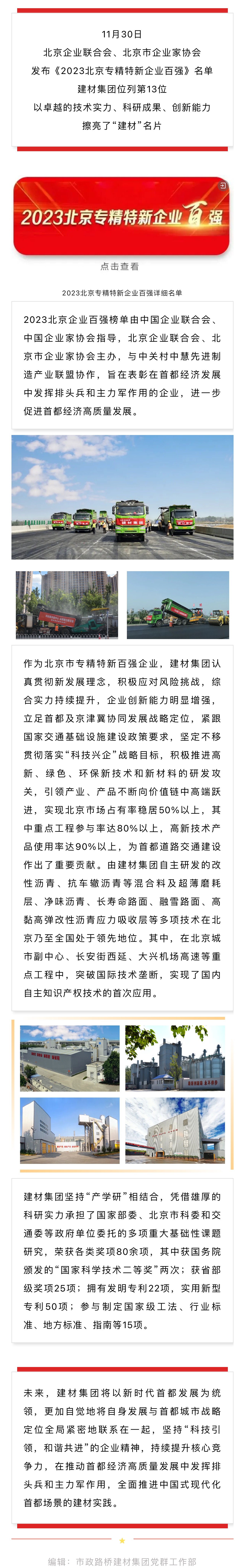 【喜报】2023北京专精特新企业百强名单出炉,建材集团榜上有名