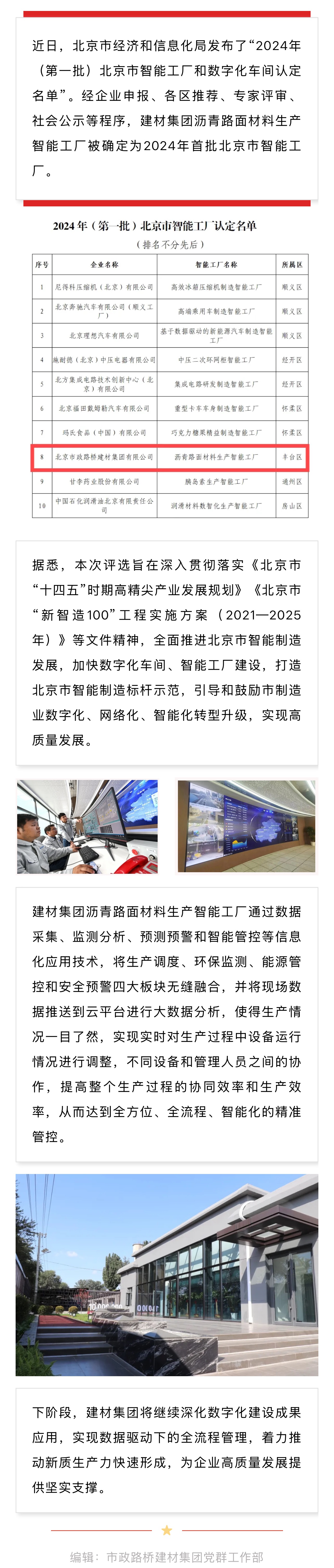 喜报|建材集团沥青路面材料生产智能工厂入选北京市智能工厂名单