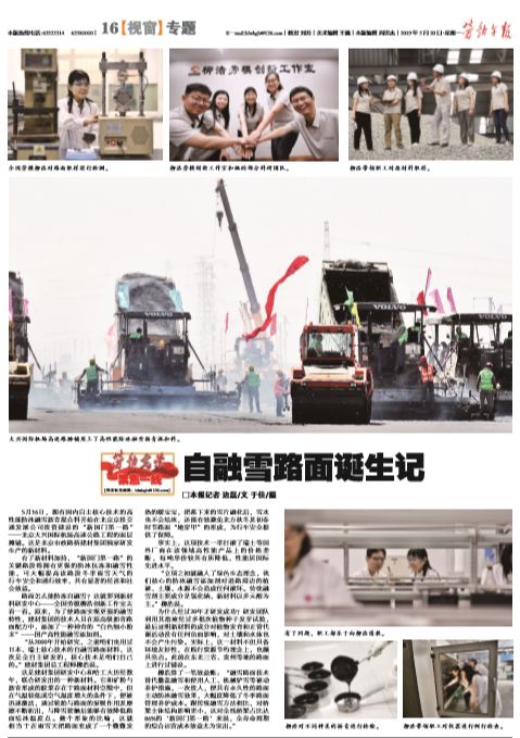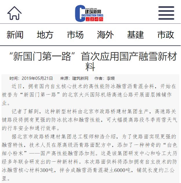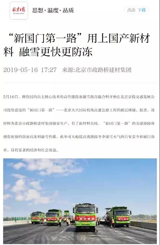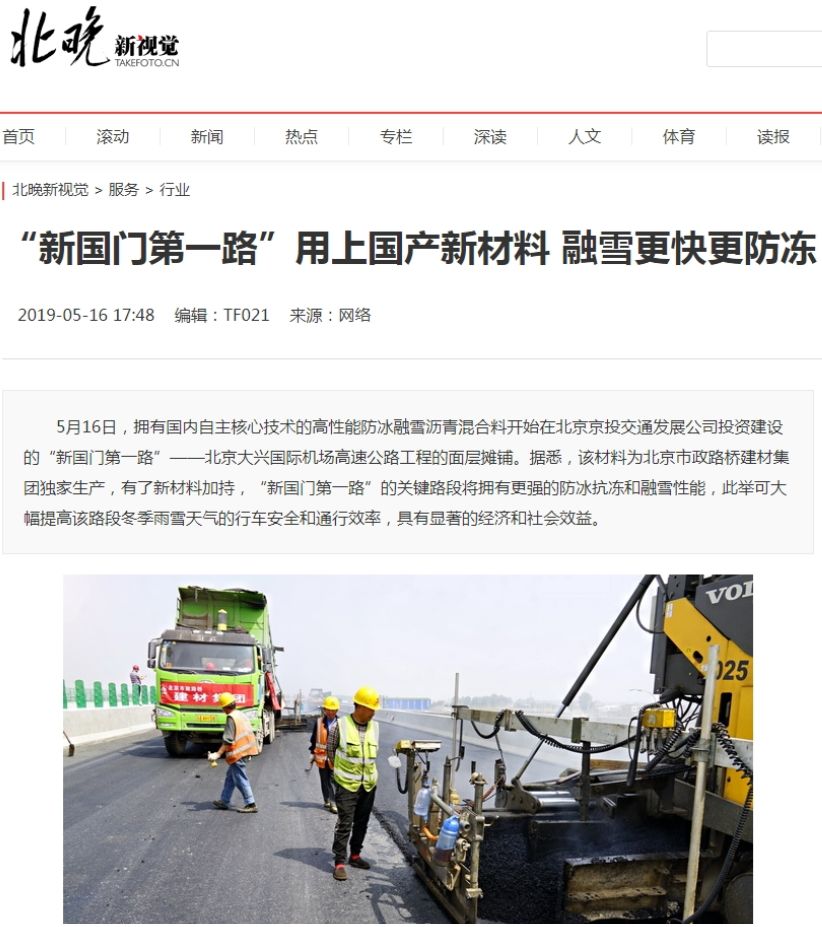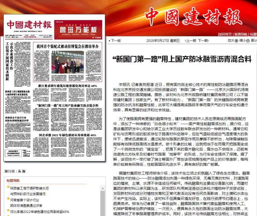公司自主研发的高性能防冰融雪沥青混合料于5月16日开始在“新国门第一路”——北京大兴国际机场高速公路的面层摊铺。BTV《特别关注》、《红绿灯》栏目和北京日报、新京报、中国建材报、劳动午报等十余家主流媒体竞相关注,通过电视台、报纸、网络新媒体等渠道共发布15篇新闻报道,其中,获得中国建材报头版和劳动午报专版专题发布。另外,新华网、中国新闻网等媒体也纷纷转发报道。