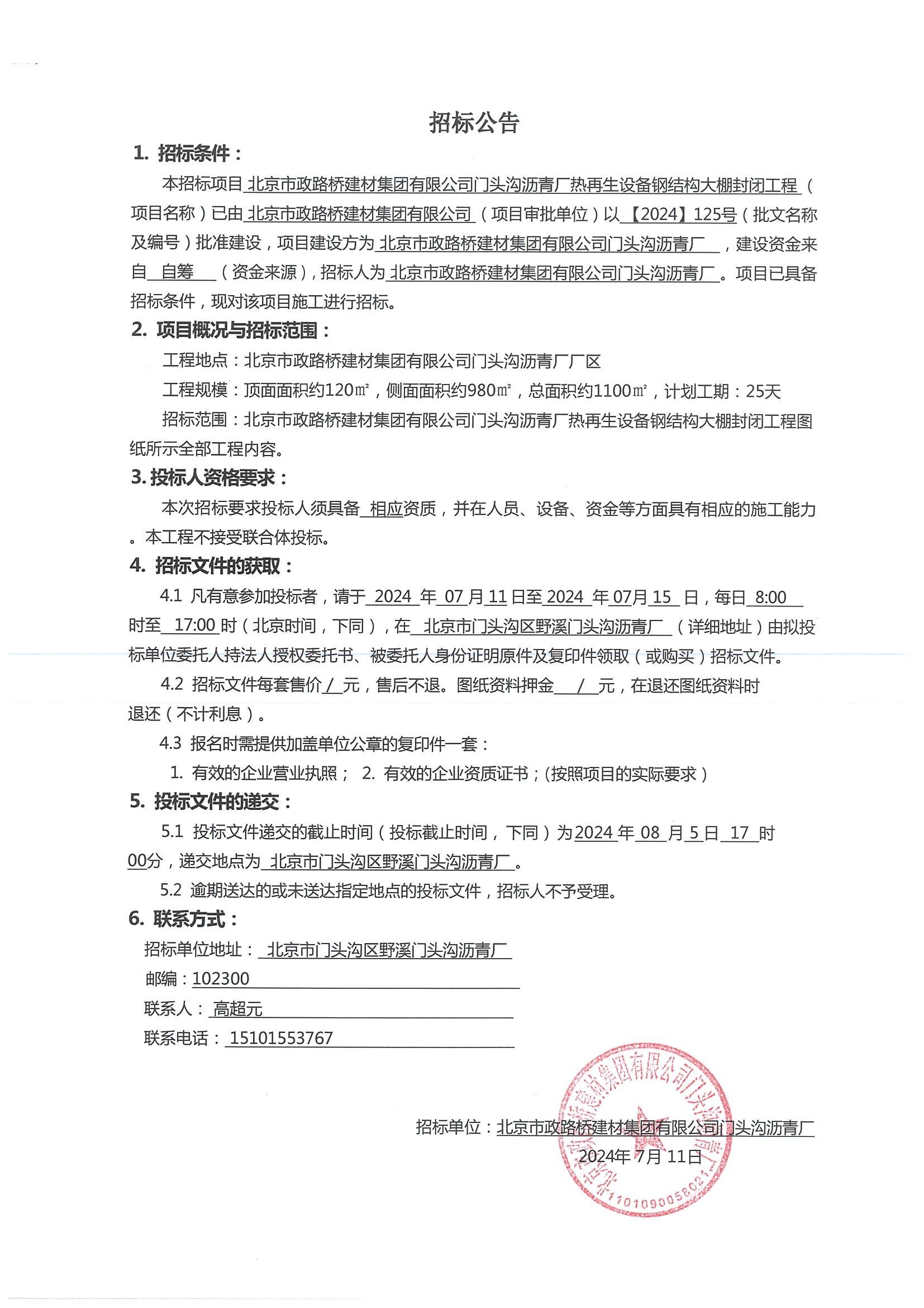 招标公告(门头沟沥青厂热再生设备钢结构大棚封闭工程)
