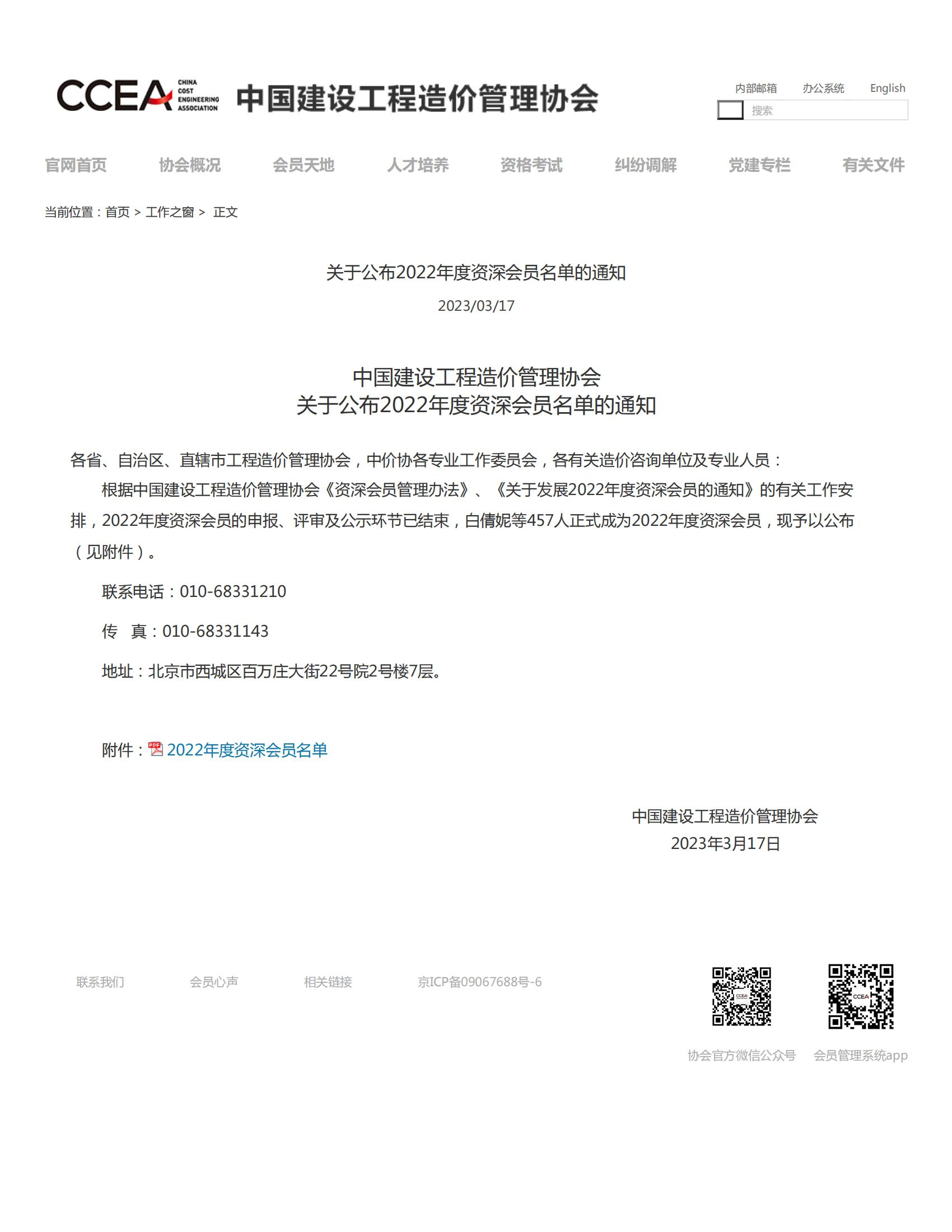 康雅晶同志成为中国建设工程造价管理协会2022年度资深会员