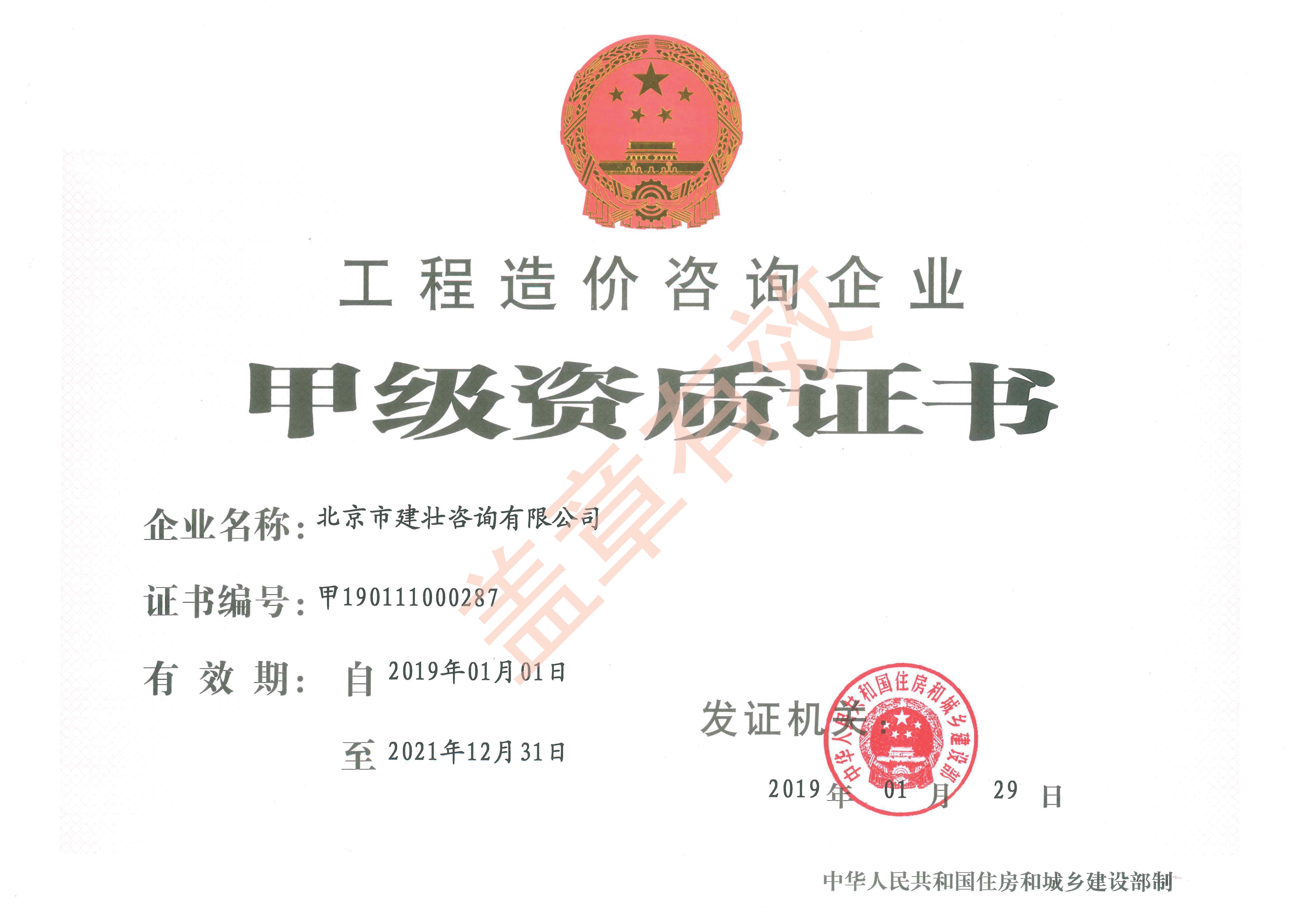 工程造价咨询企业甲级资质证书