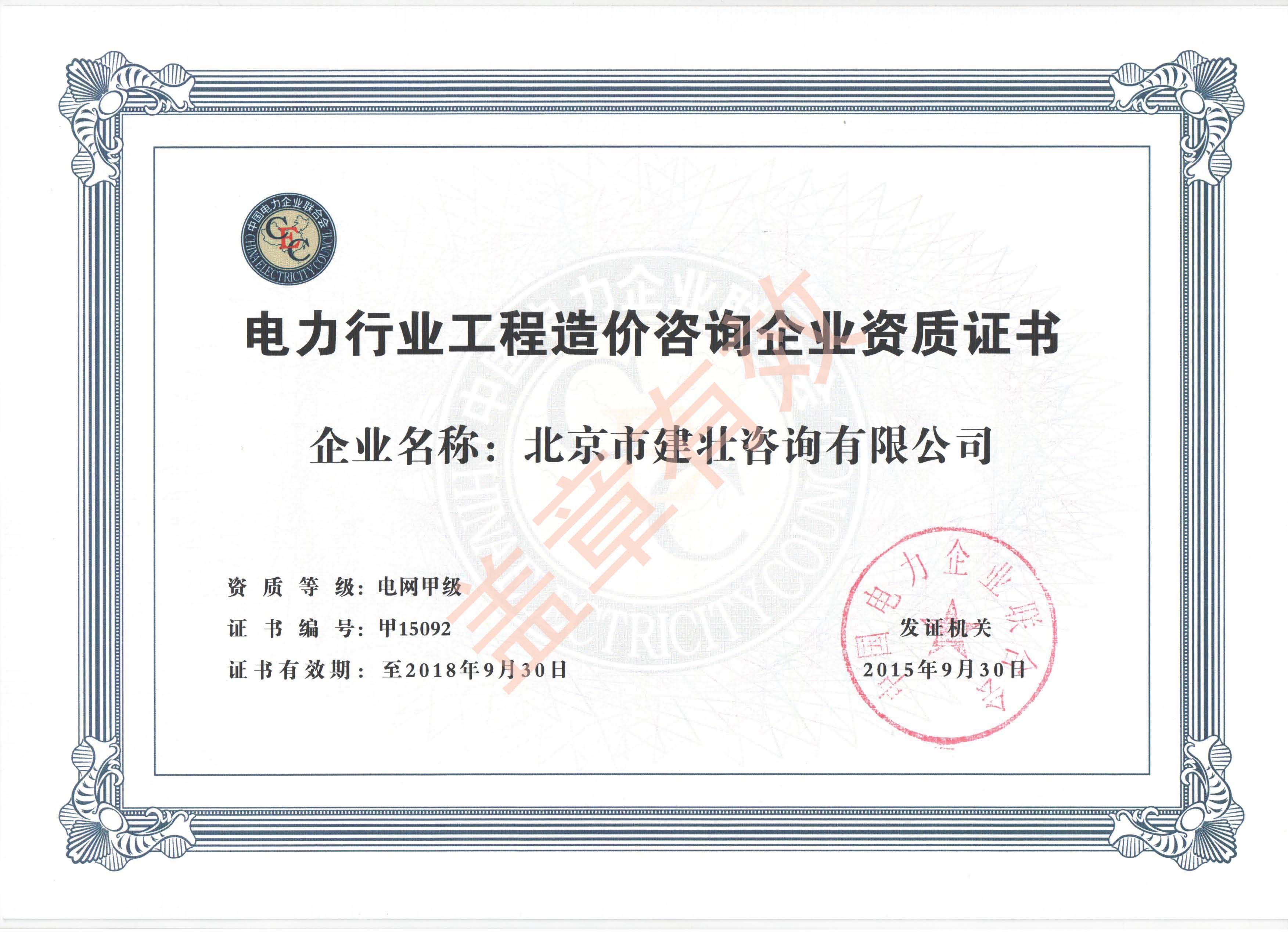 电力行业工程造价咨询企业电网甲级资质证书