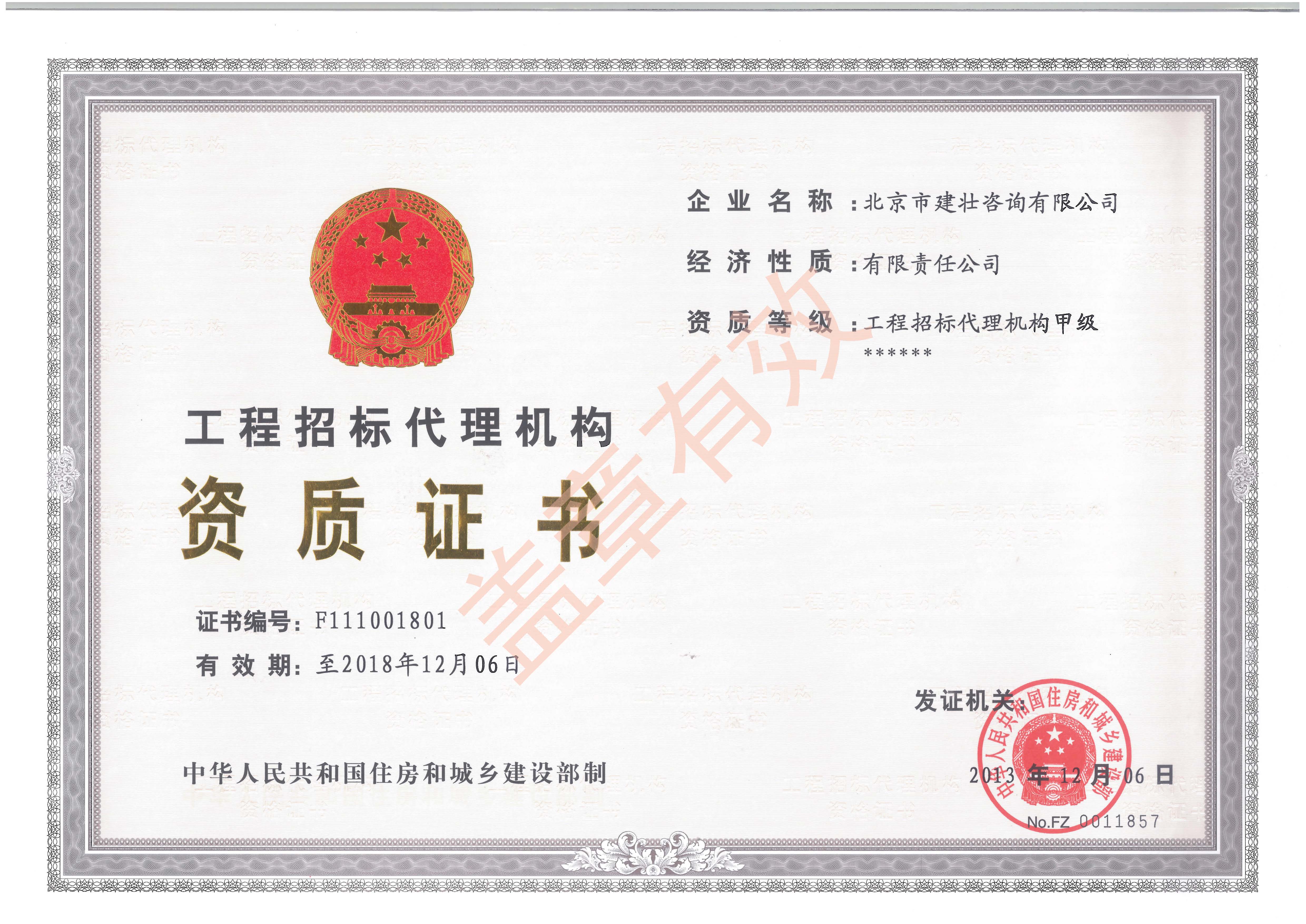 工程招标代理机构甲级资质证书