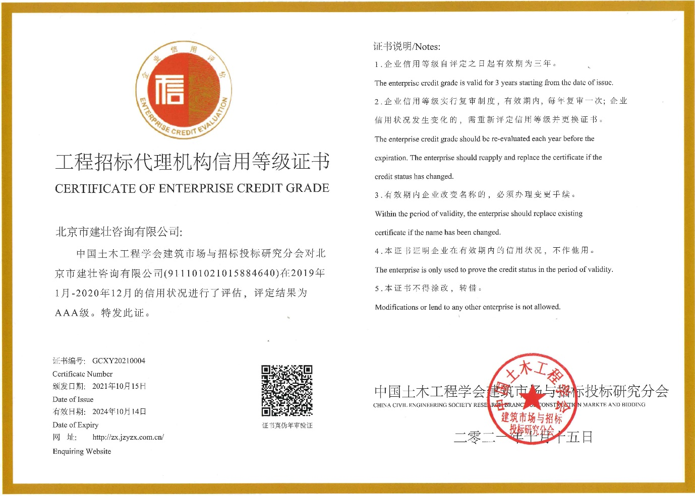中国土木工程协会AAA级工程招标代理机构信用等级证书