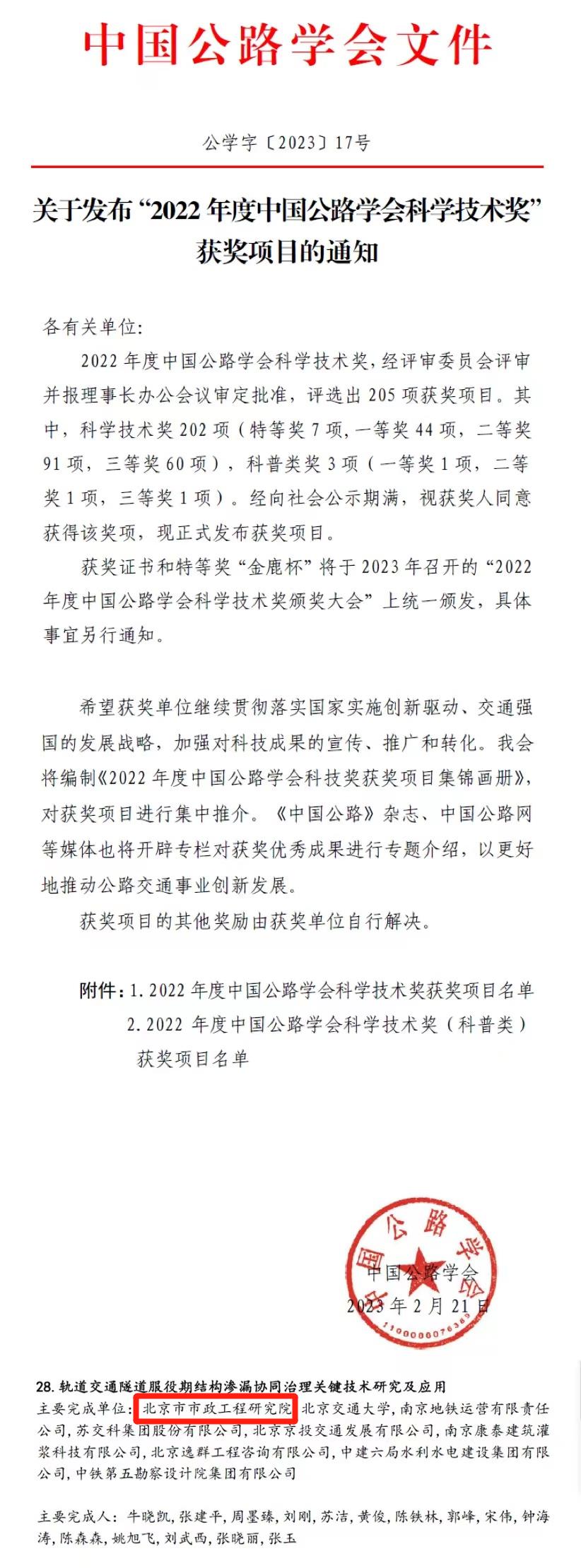 近日,中国公路学会公布了2022年中国公路学会科学技术奖评审结果,由科技发展公司研究院牵头完成的《轨道交通隧道服役期结构渗漏协同治理关键技术研究及应用》获科学技术奖一等奖。该项目为我国轨道交通隧道服役期结构渗漏水治理施工提供了有力的理论和技术支持,本次获奖充分展现了科技发展公司多年来在地下工程病害治理中的研究成果和技术实力。