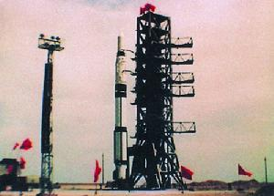 图|搭载中国第一颗人造地球卫星“东方红一号”的“长征一号”火箭在酒泉卫星发射中心点火升空