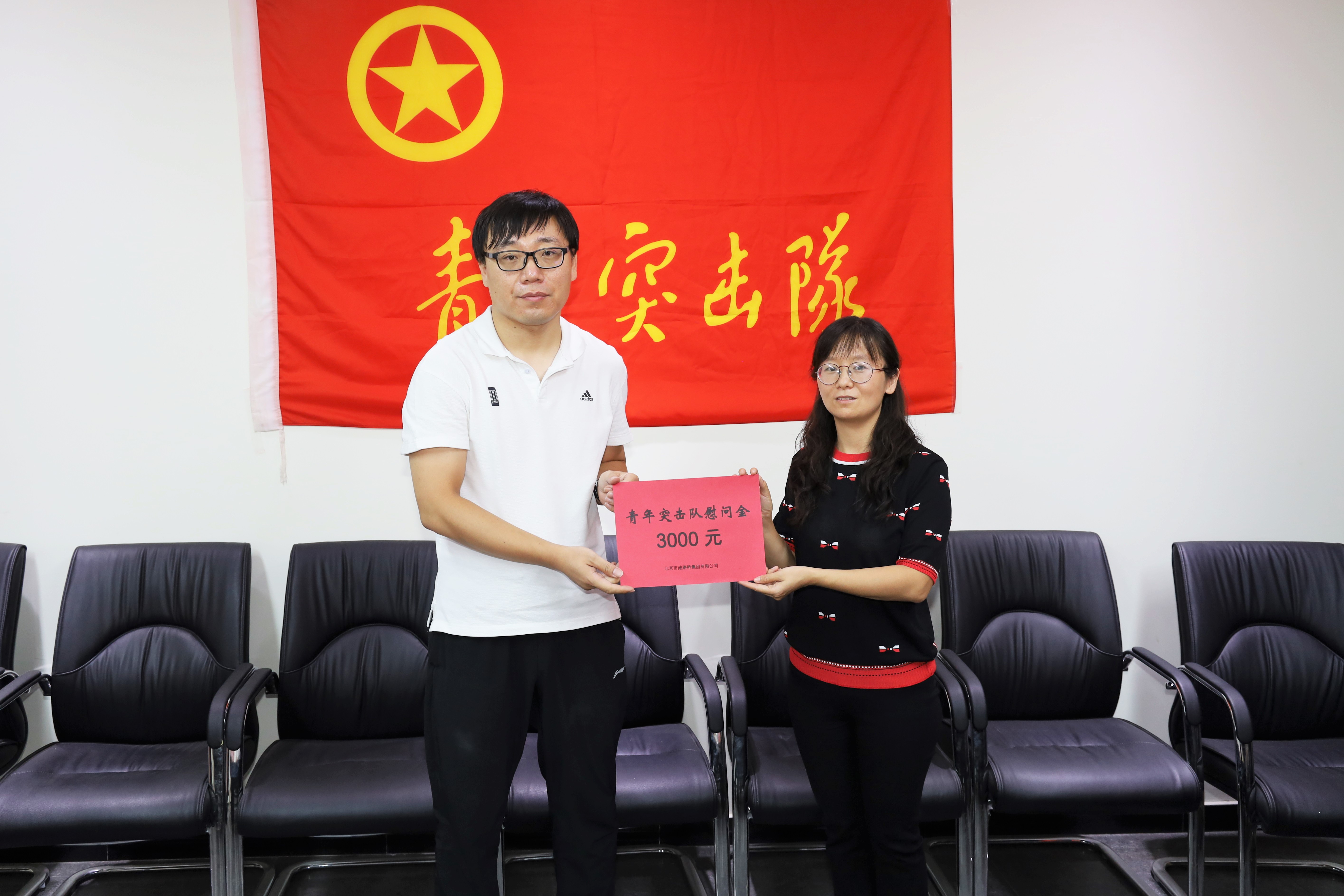 集团公司党委组织部副部长、团委书记李倩将慰问金送到青年突击队手中