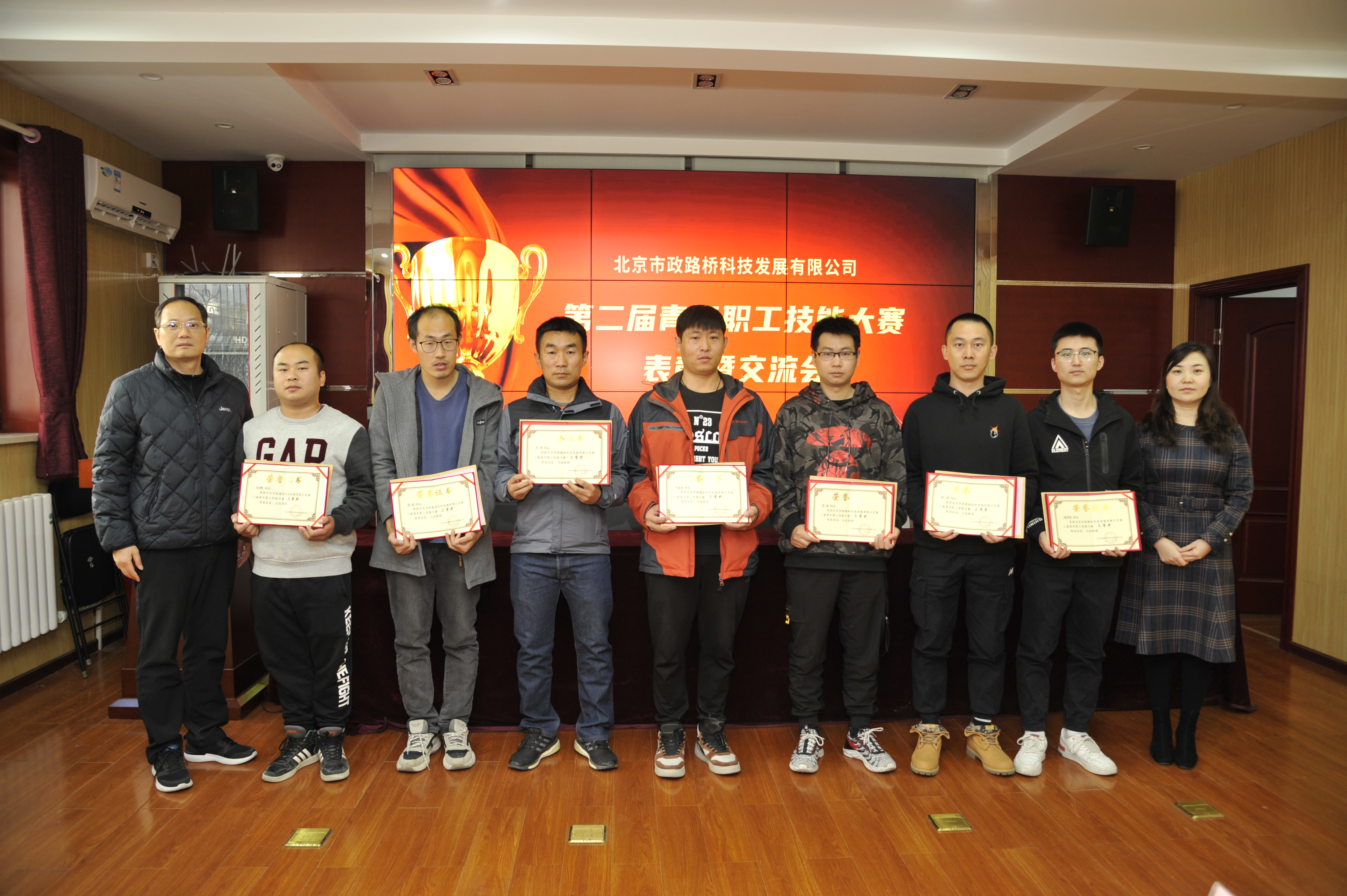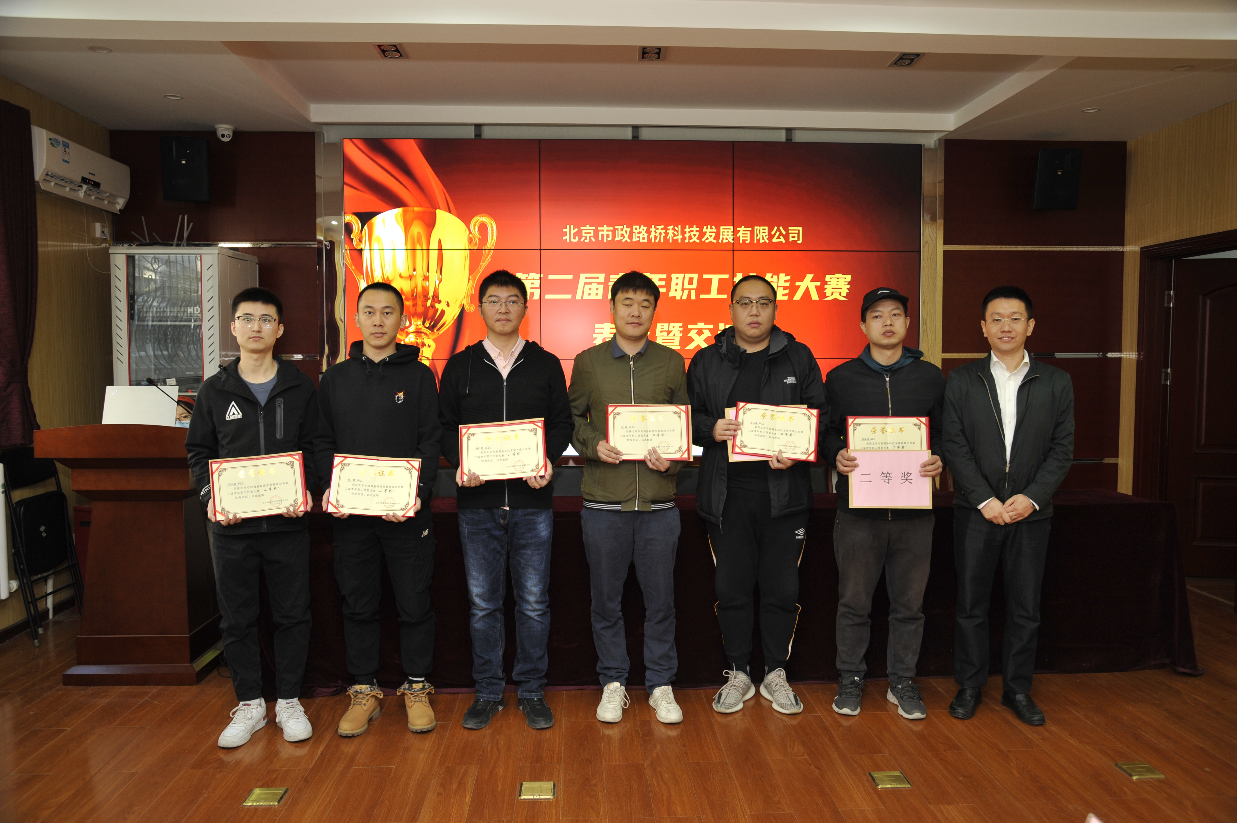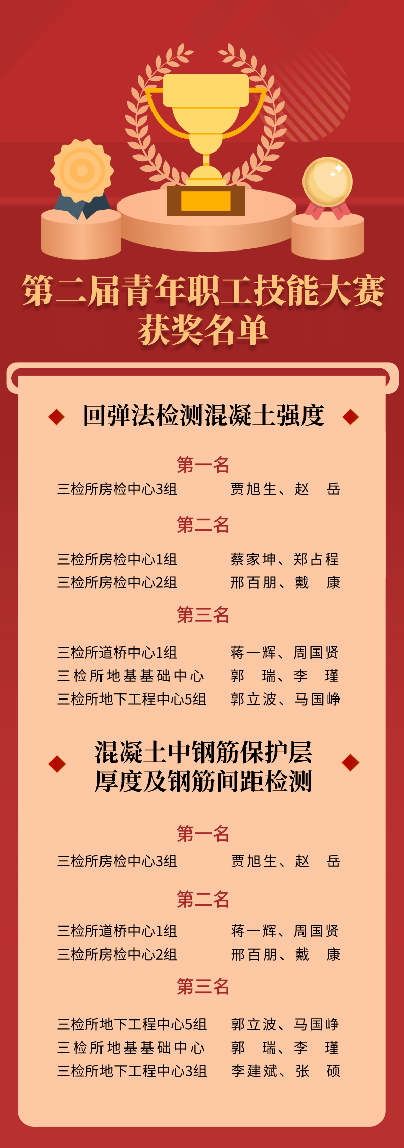 本次大赛设回弹法检测混凝土强度和混凝土中钢筋保护层厚度及钢筋间距检测两个项目,共有16组32人报名参加,经过激烈角逐,共评选出一等奖2组4人,二等奖4组8人,三等奖6组12人。公司组织人事部部长吴冰宣布了第二届青年职工技能大赛比赛成绩,公司领导先后为获奖队伍颁奖并合影留念。