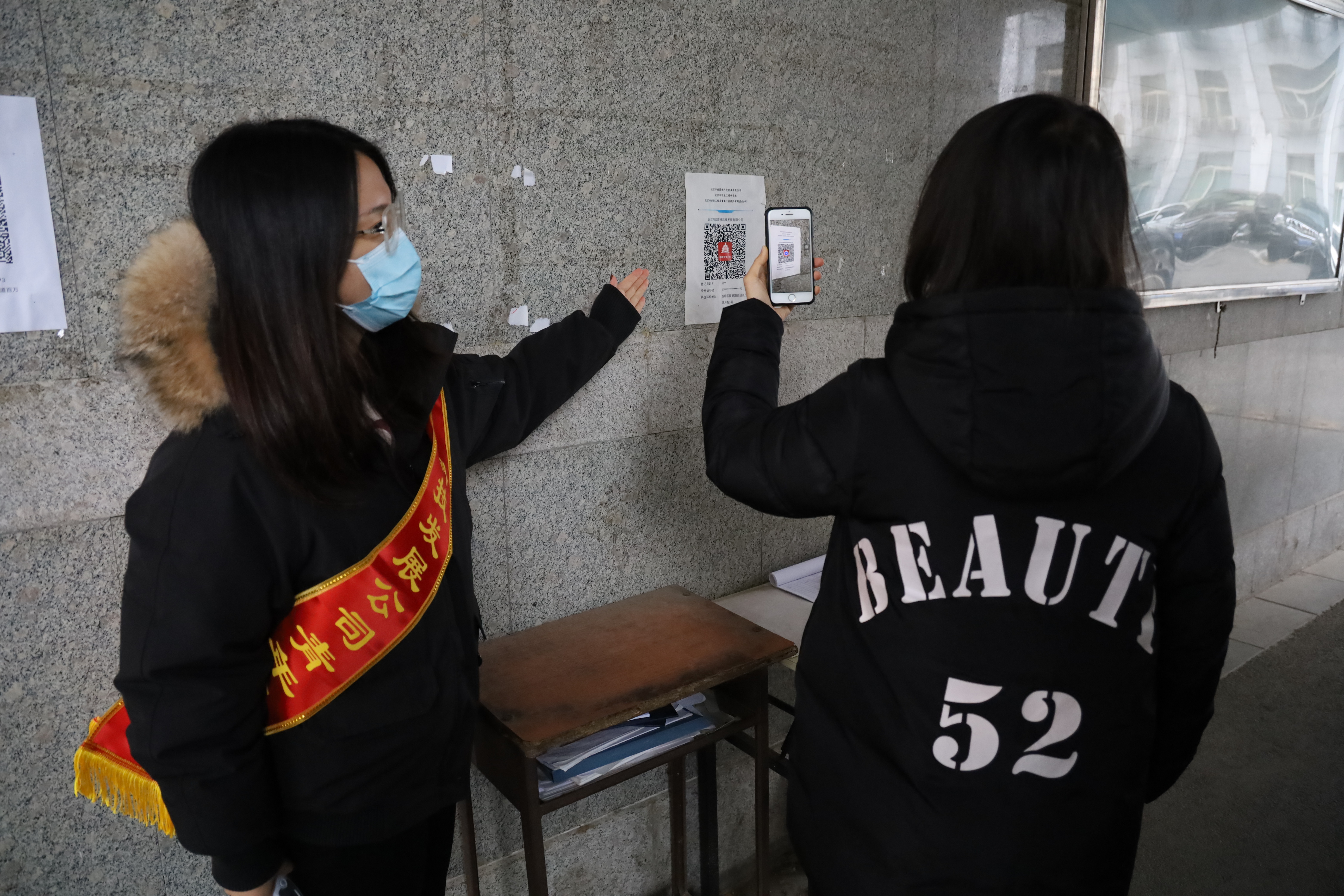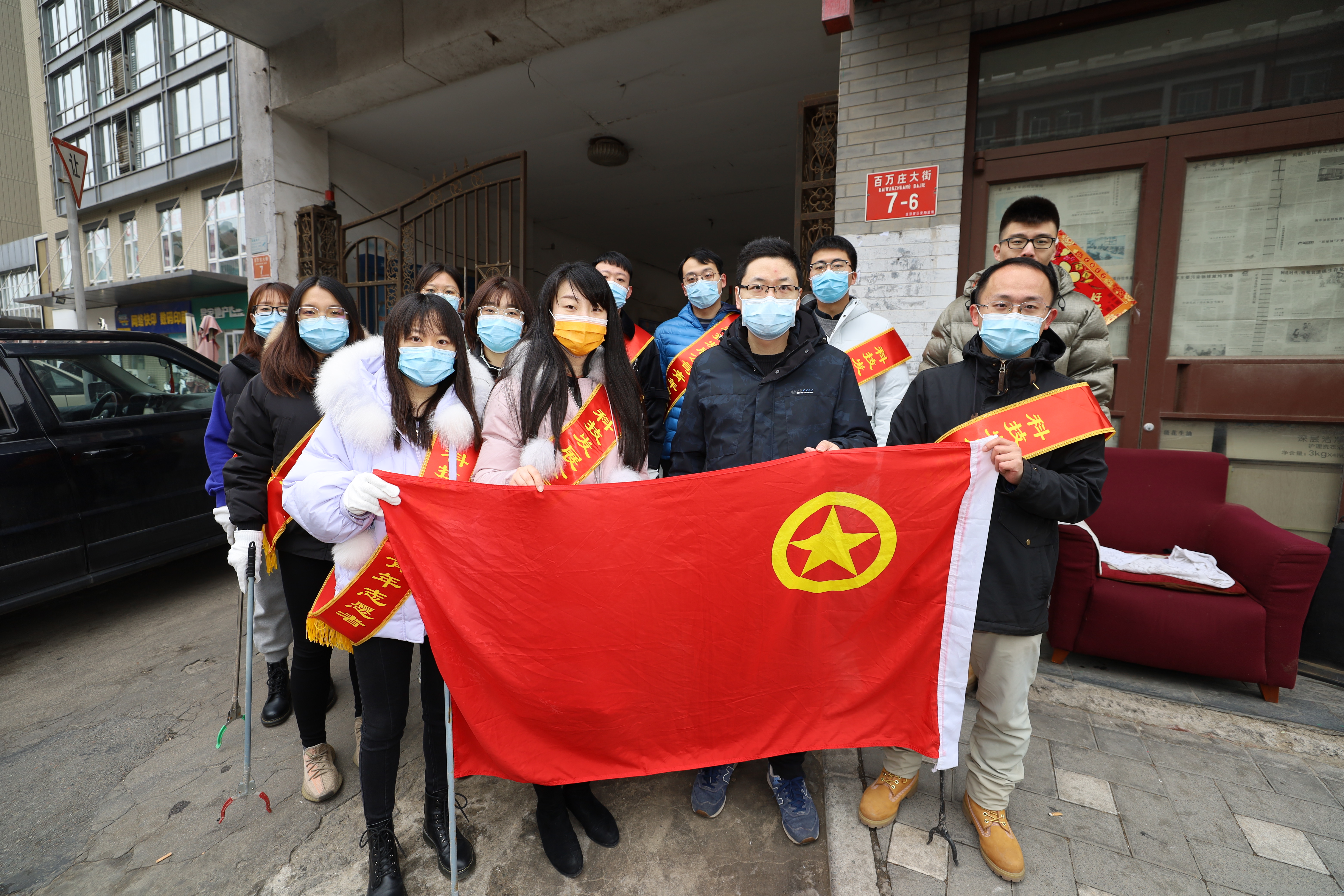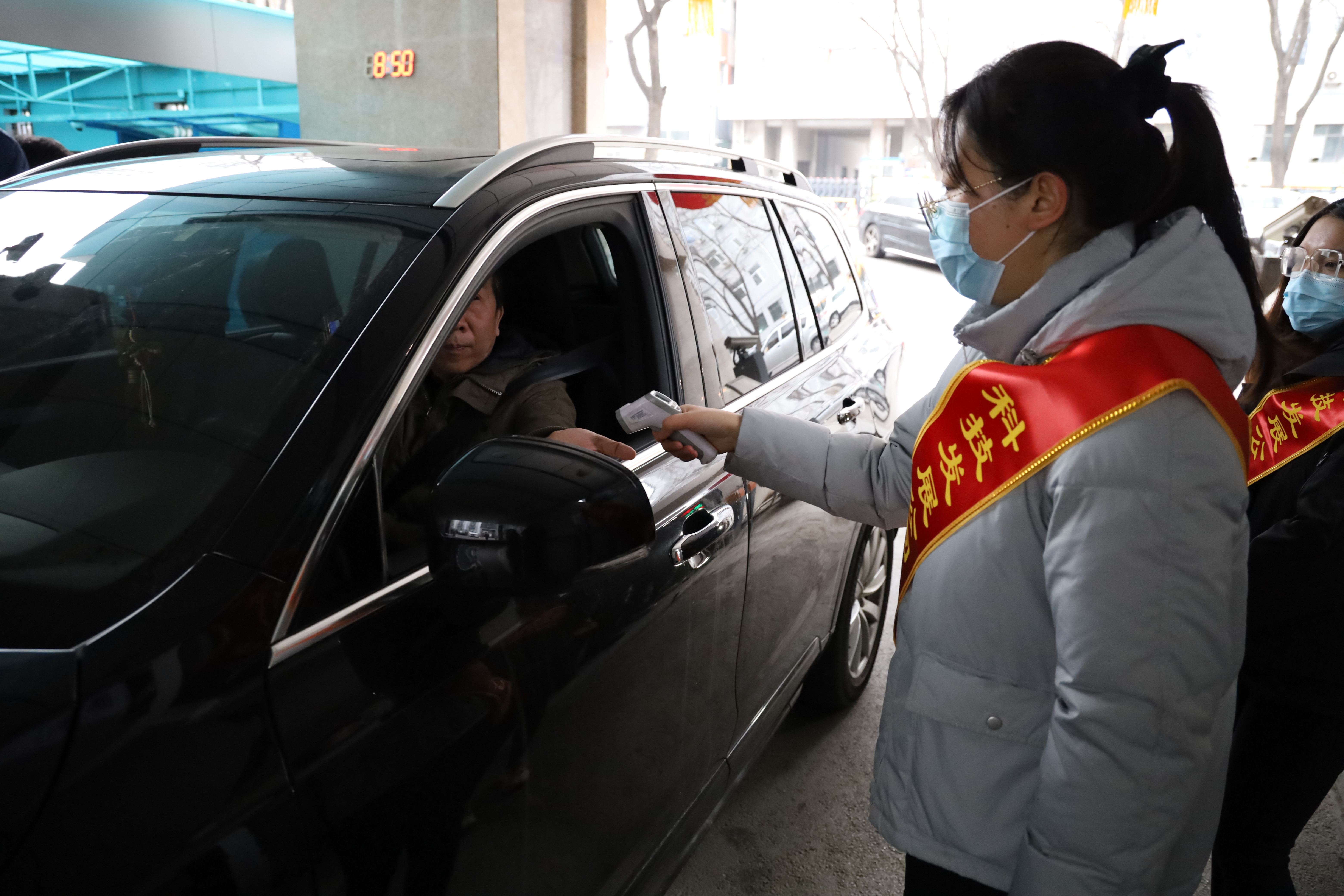 科技发展公司组织青年志愿者对进入单位的职工开展测量体温、检查健康宝、车辆登记、秩序维护等工作,提醒大家养成卫生健康生活习惯。