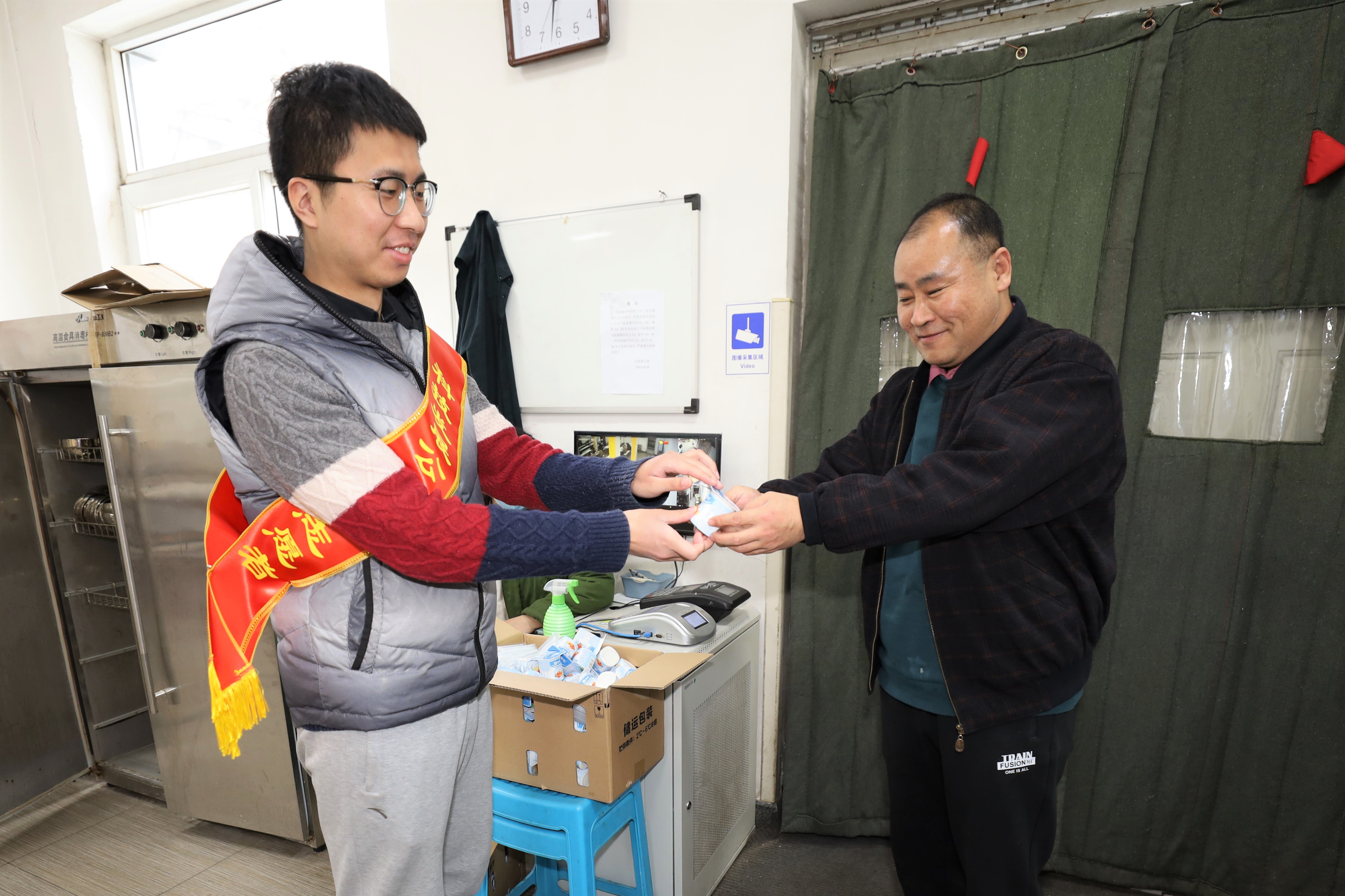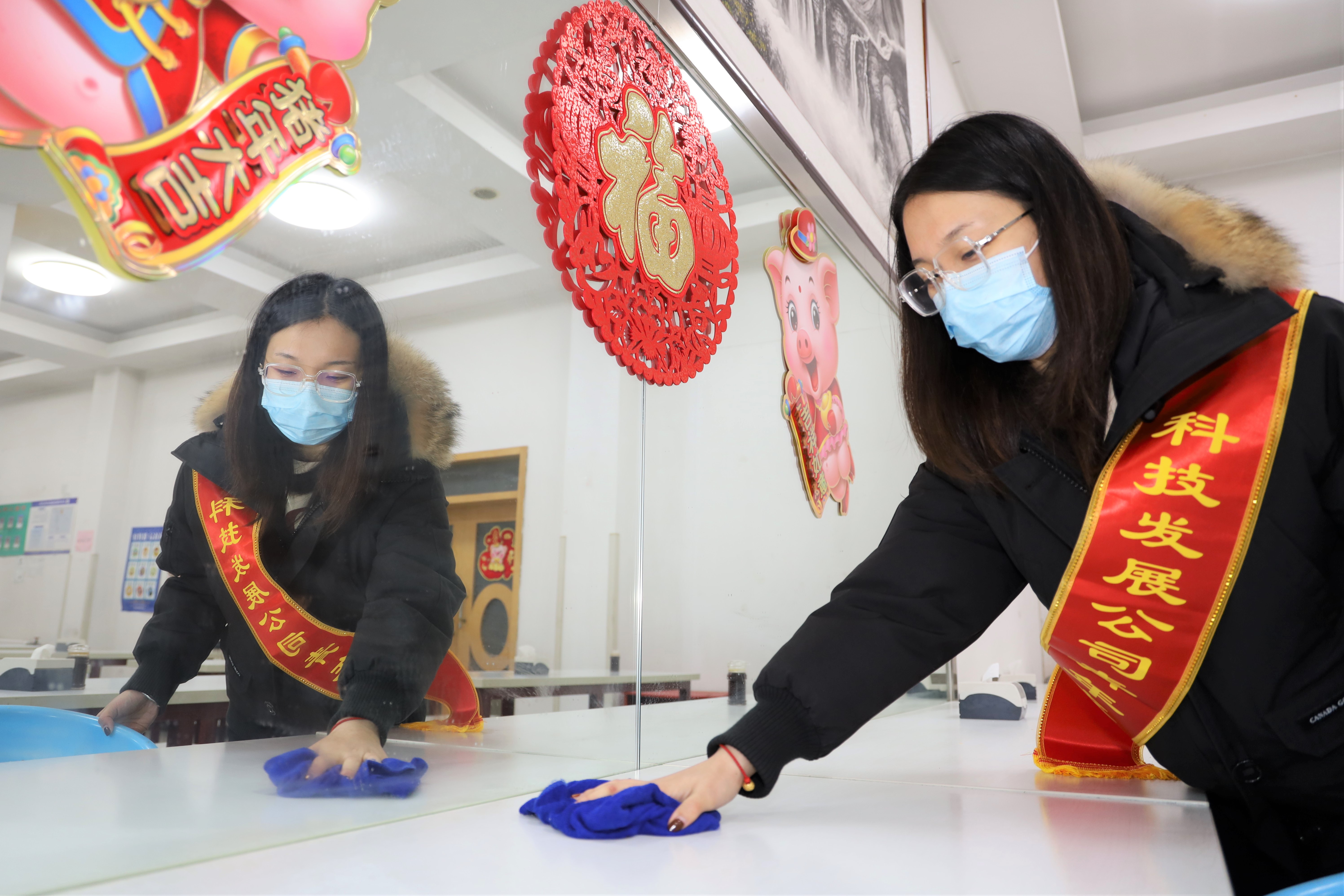 在职工食堂,志愿者拿着抹布、消毒工具和拖把进行大扫除,清洗餐桌、餐椅,打扫就餐区卫生,打造整洁有序的就餐环境。