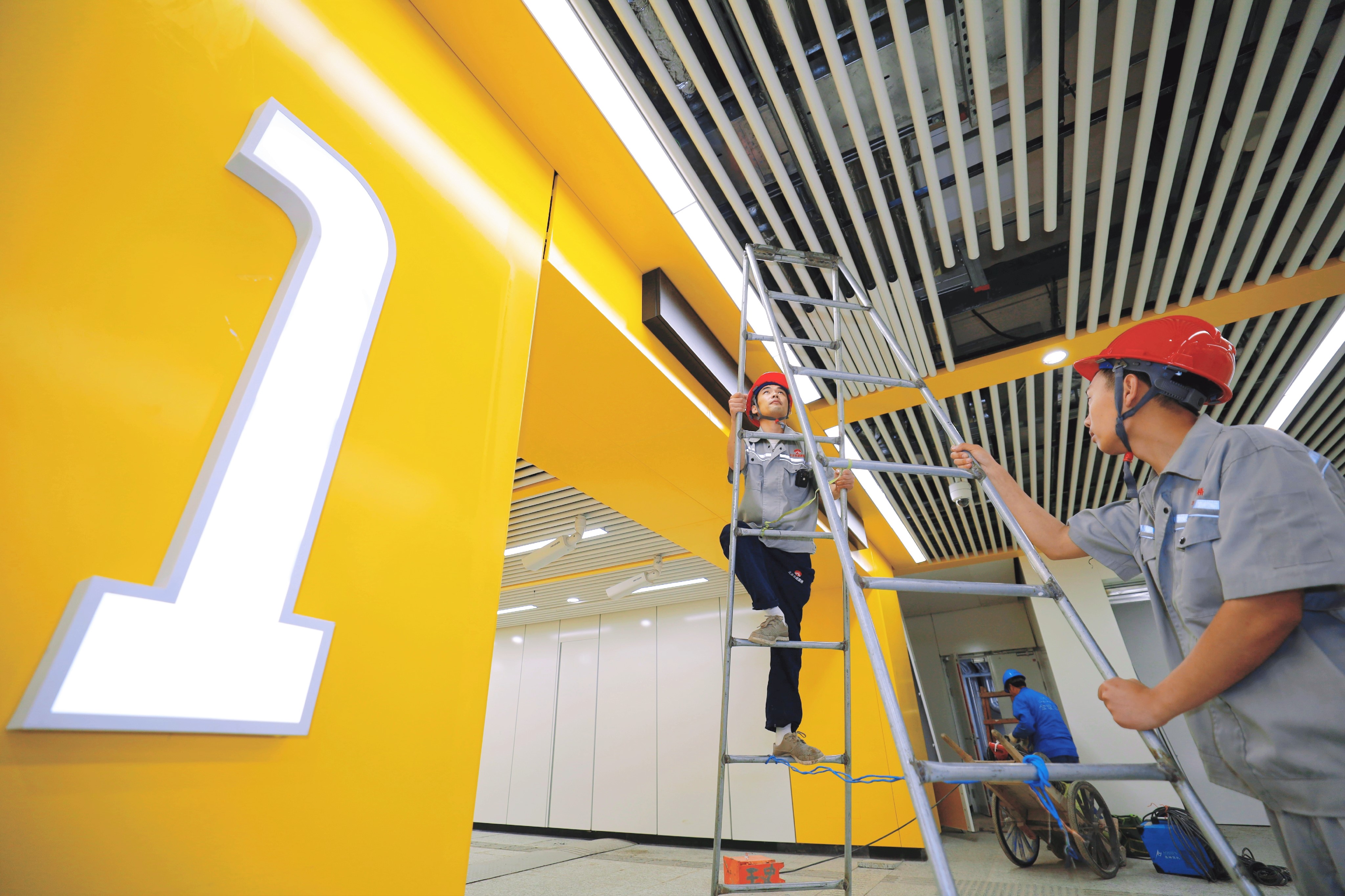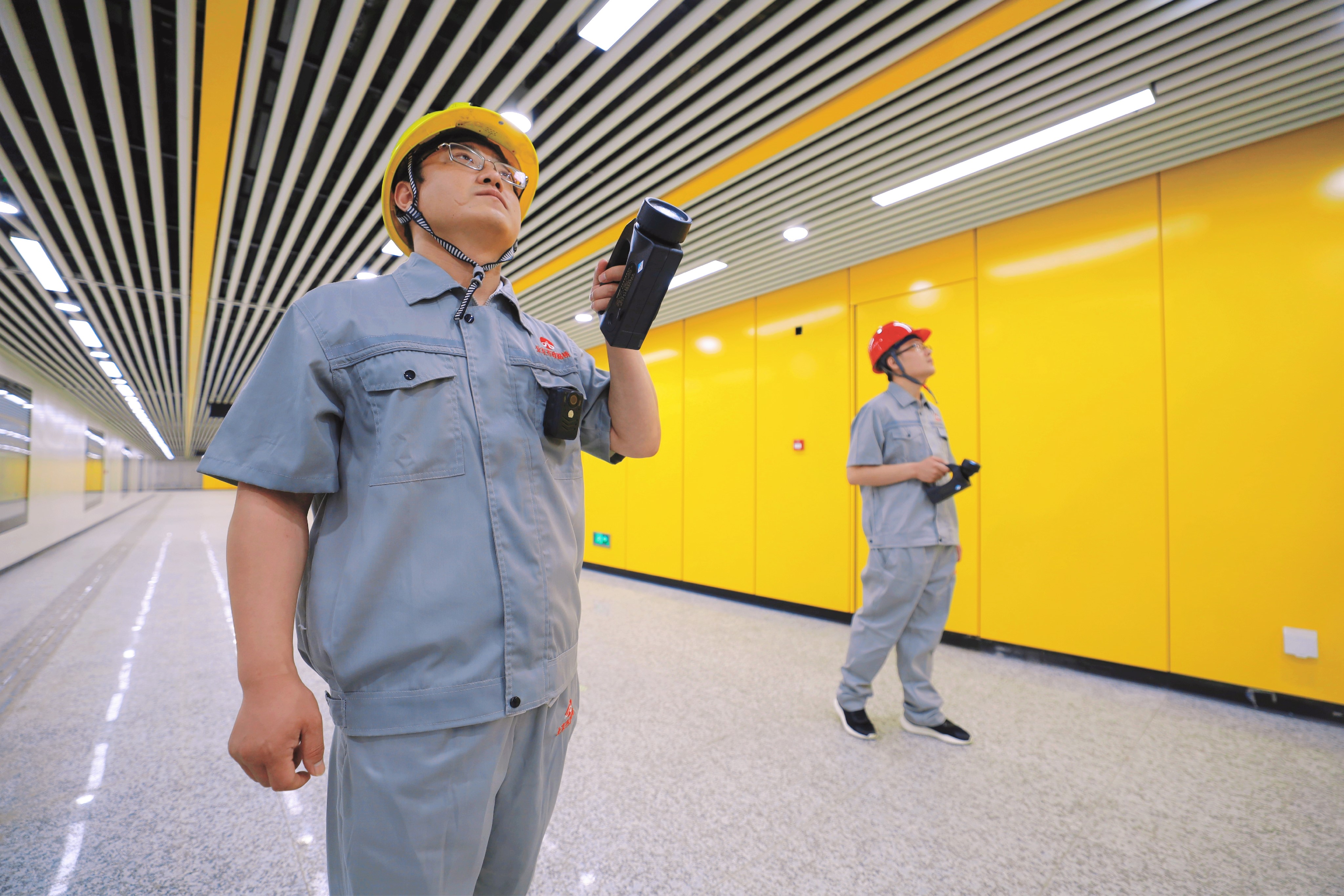 ▲当首班地铁运营前,维保人还要对车站内进行最后的安全检查。