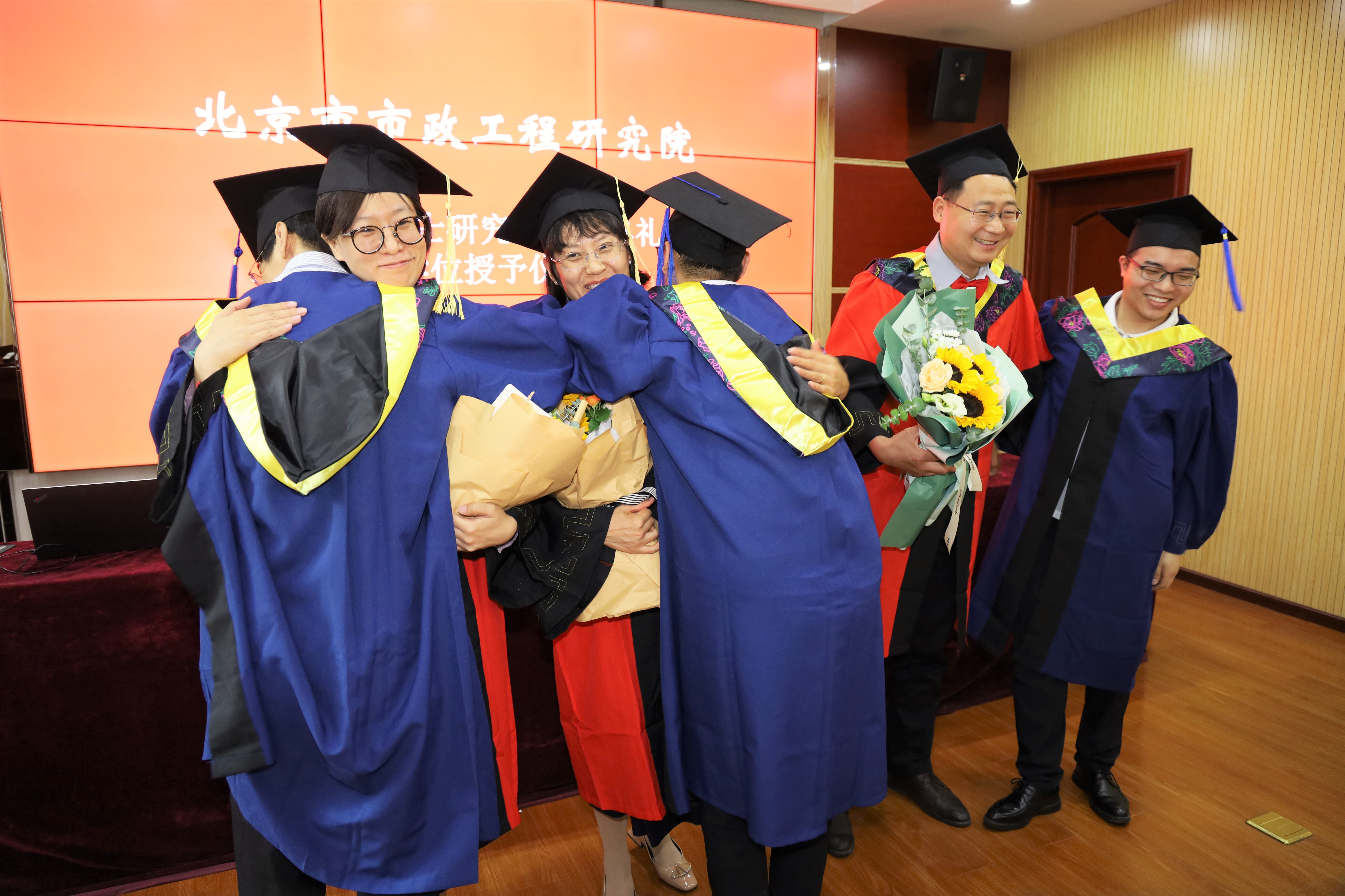 毕业生向导师献上鲜花,与导师亲切拥抱。