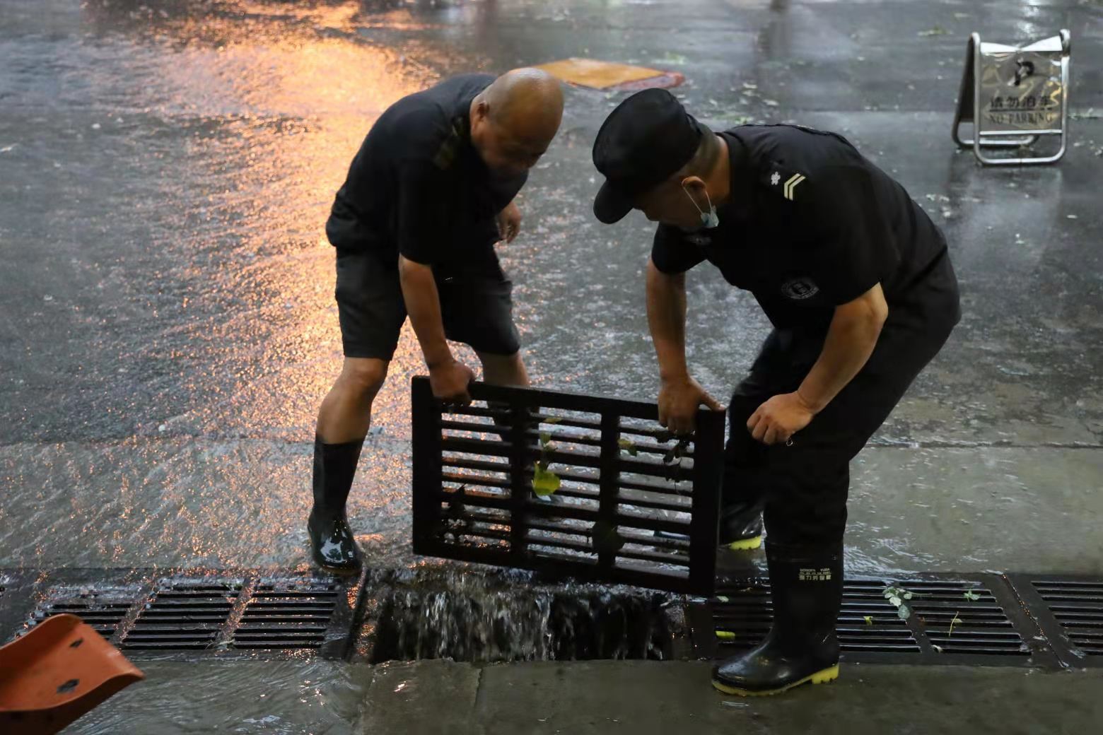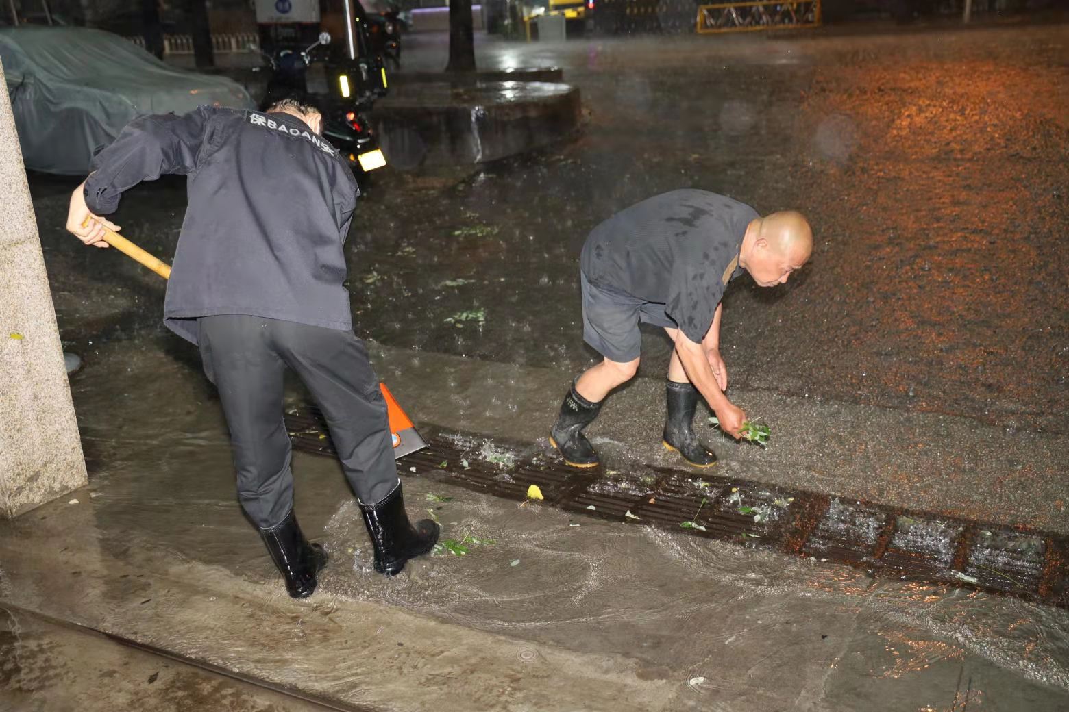 ▲防汛人员打捞清理雨水口的淤堵杂物,确保积水路段排水畅通。