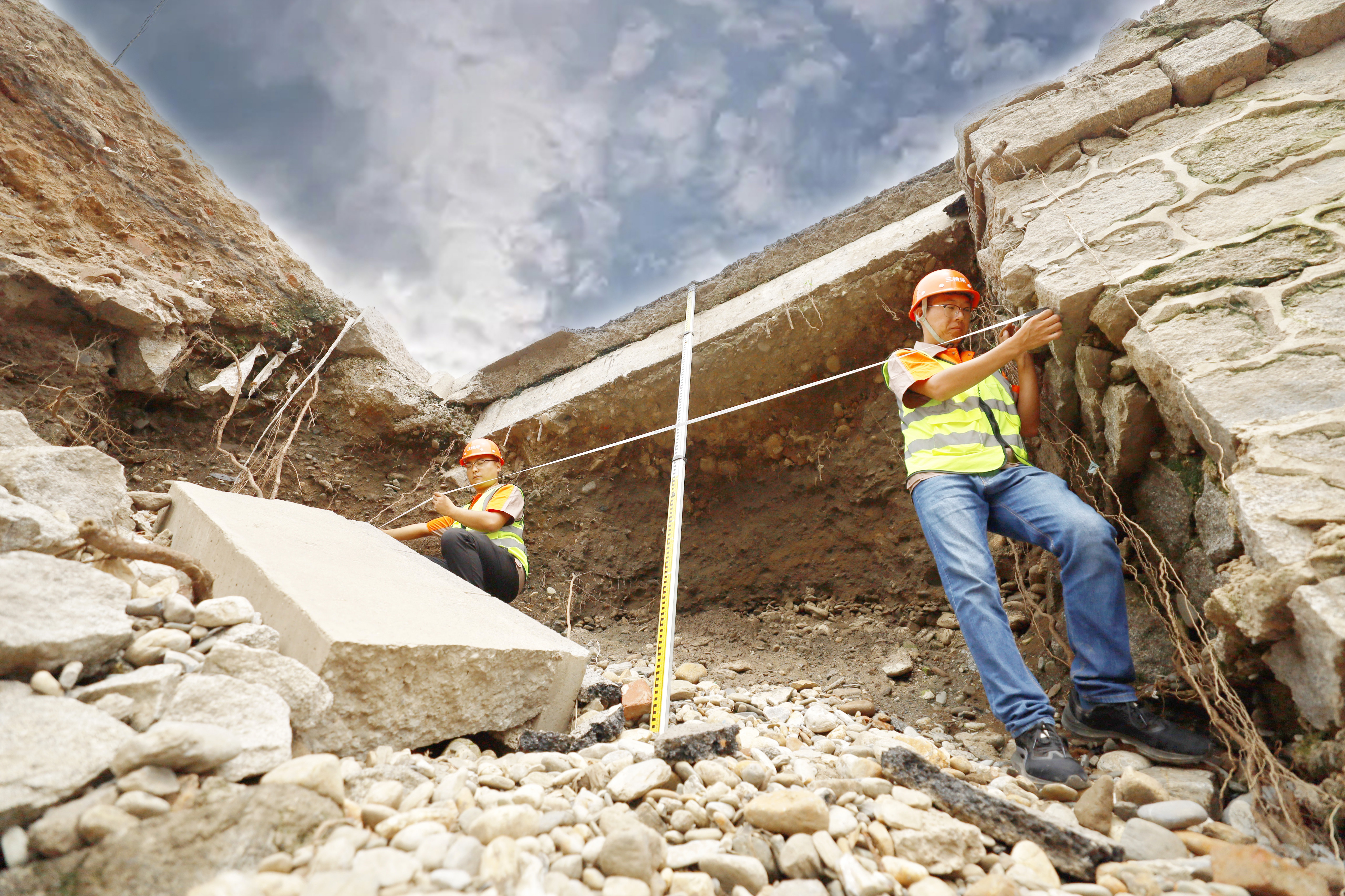 降雨过后,气温回升,河道内湿热难挡。只见检测人员头戴安全帽,手持测量工具,小心的爬上已经塌落的碎石堆,仔细丈量脱空数据,不时还要躲避上方掉落的泥石。“再苦再累也要守护群众安全,履行好国企担当!”检测人员挥着汗水这样说道。