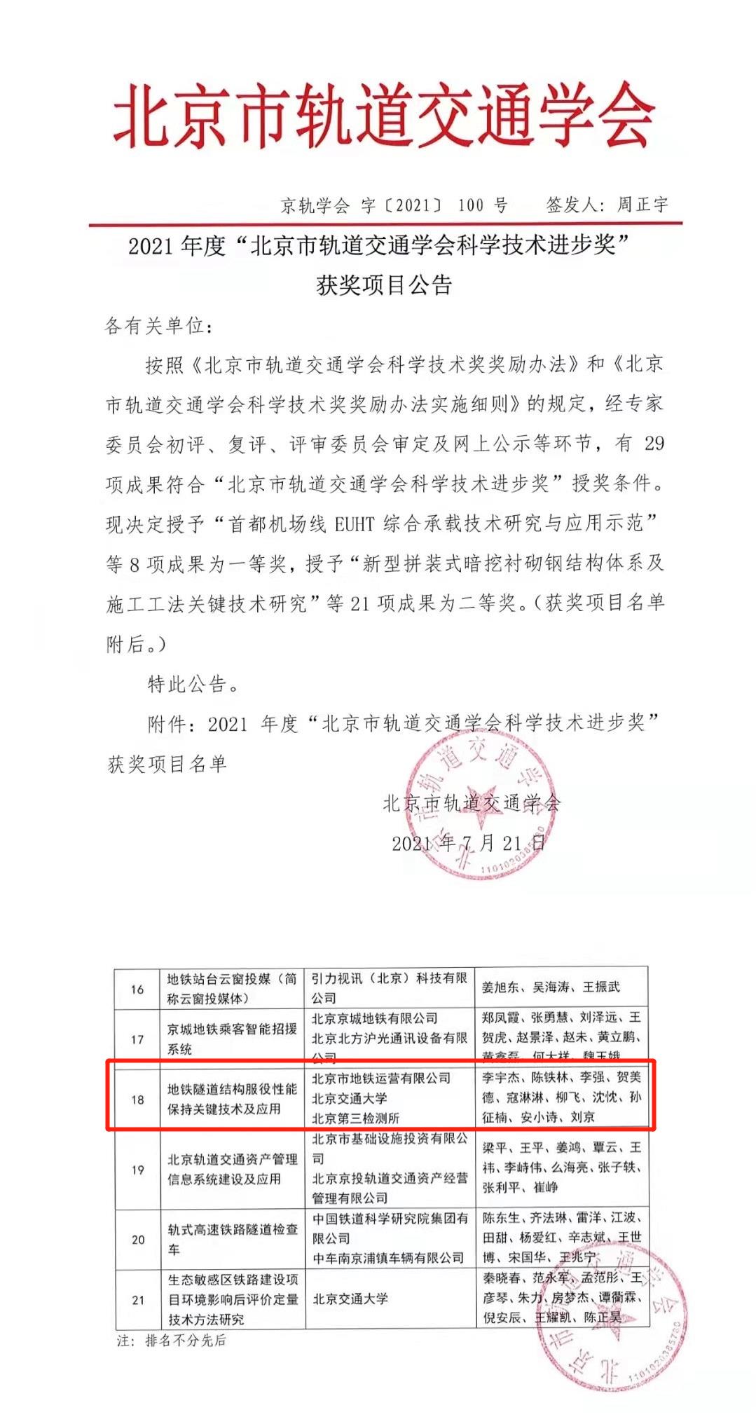 近日,2021年度北京市轨道交通学会科学技术进步奖获奖结果正式揭晓,科技发展公司三检所《地铁隧道结构服役性能保持关键技术及应用》项目荣获北京市轨道交通学会科学技术进步奖二等奖。