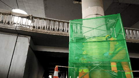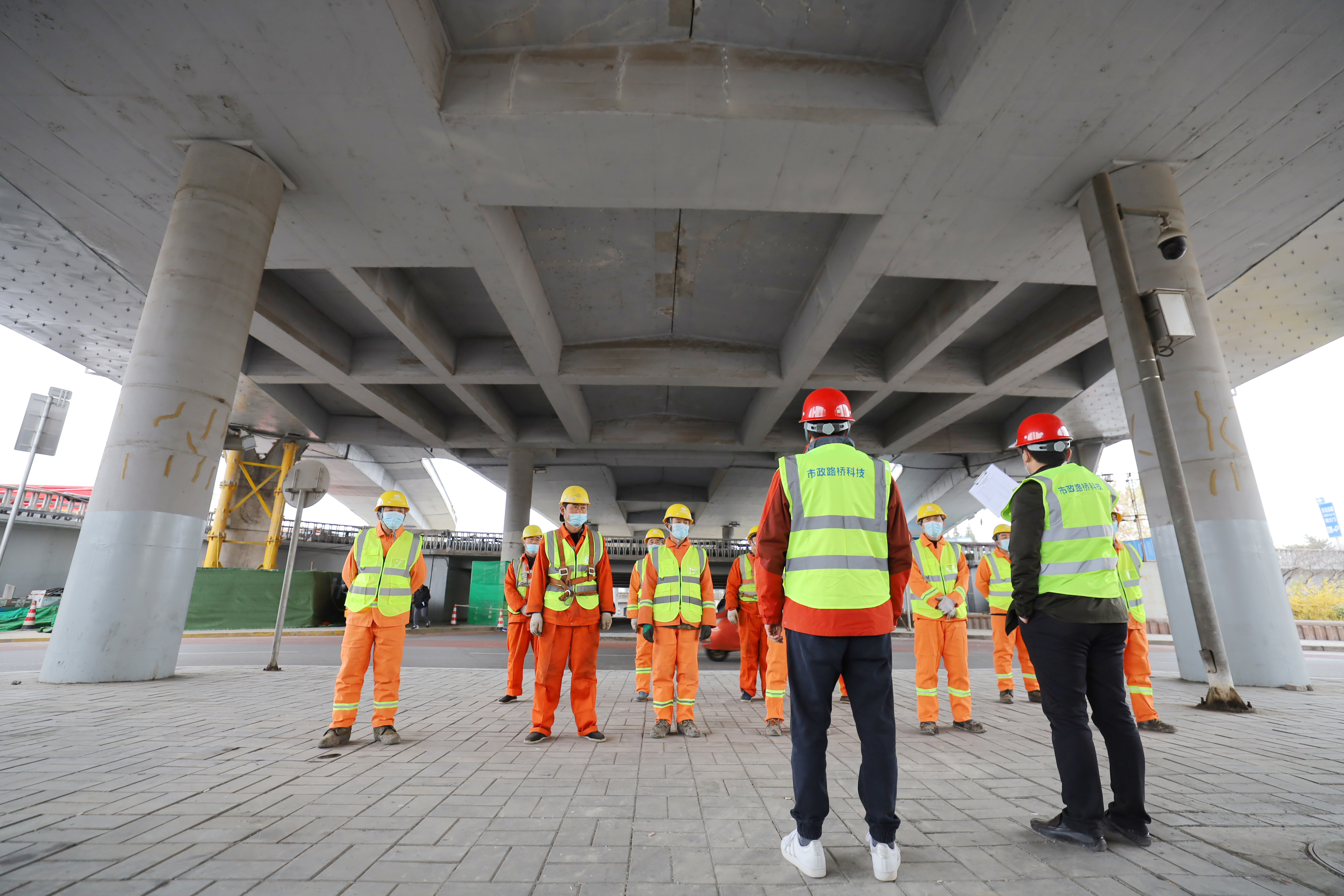 ▲玉蜓桥在设计之初,为表现桥体犹如蜻蜓展翅欲飞的状态,部分桥梁墩柱选择了结构更加轻盈的Y型墩柱。对于这种Y型墩柱的加固治理,工程材料中心采用针对性的加固及美化措施,利用同步顶升钢支撑结构的方式,进行包芳纶纤维布,有效提高了结构强度和耐久性。