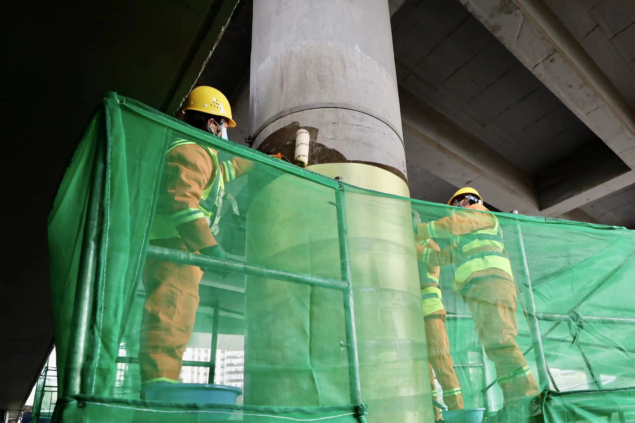▲大修中,工程材料中心研判病害成因,采取针对性的加固维修及美化措施,为52处桥梁墩柱进行粘贴芳纶纤维布加固,对2处墩柱进行外包钢板抗震加固,提高结构安全性的同时,改善了路域的环境景观。