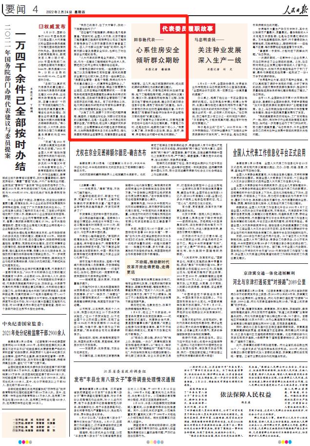 2月24日,《人民日报》在第04版:要闻中,刊发全国人大代表、科技发展公司研究院副院长、三检所总工程师田春艳的“两会声音”:心系住房安全 倾听群众期盼(代表委员履职故事),以下是报道全文▼