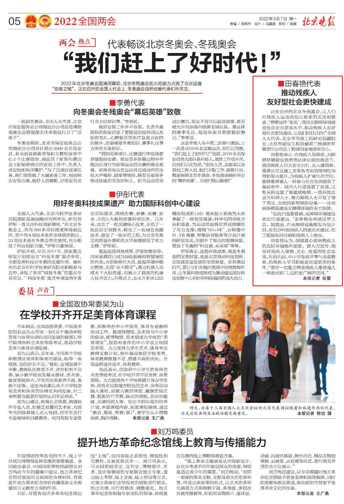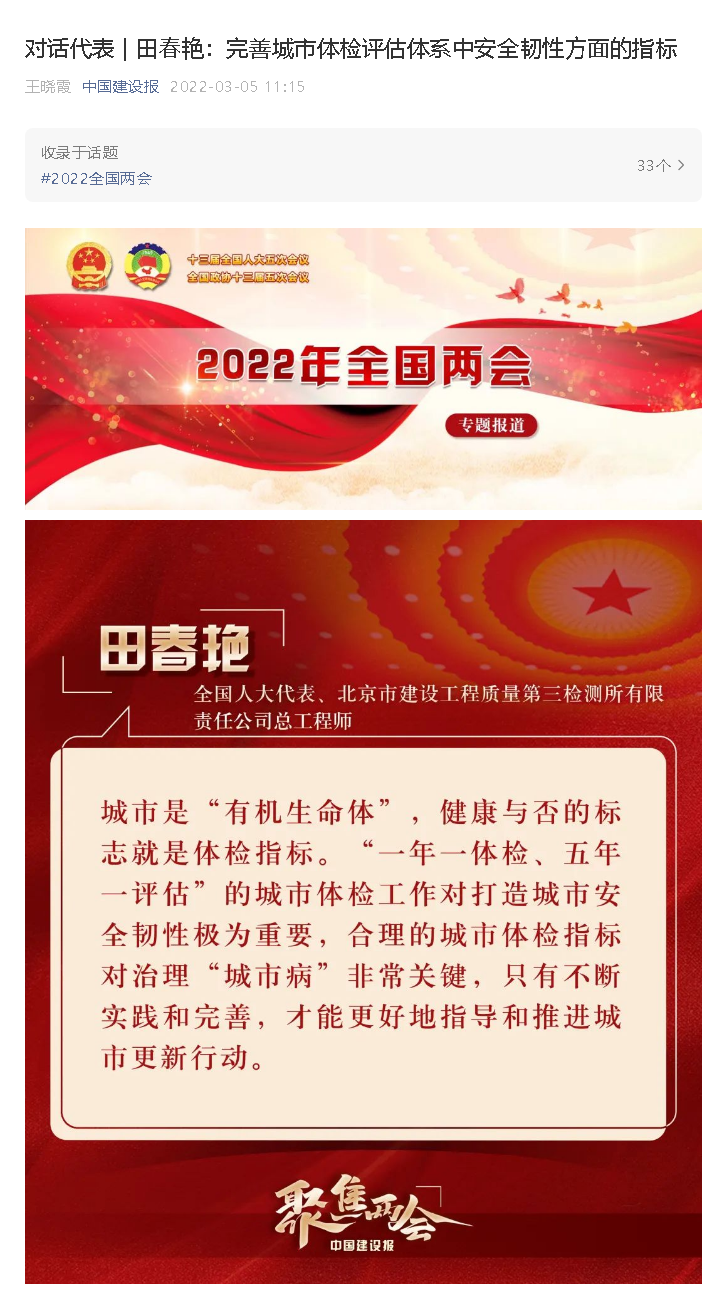 全国人大代表、科技发展公司研究院副院长、三检所总工程师田春艳今年在两会上提出的“加大科技创新与工程建设融合力度”、“推动残疾人友好型社会更快建成”、“从源头减少固体废弃物”等建议受到中央电视台、《人民日报》、《中国建设报》、北京卫视、《北京日报》、《北京晚报》等多家媒体关注,聚焦发展,共商国是,共话民生。