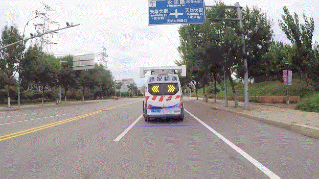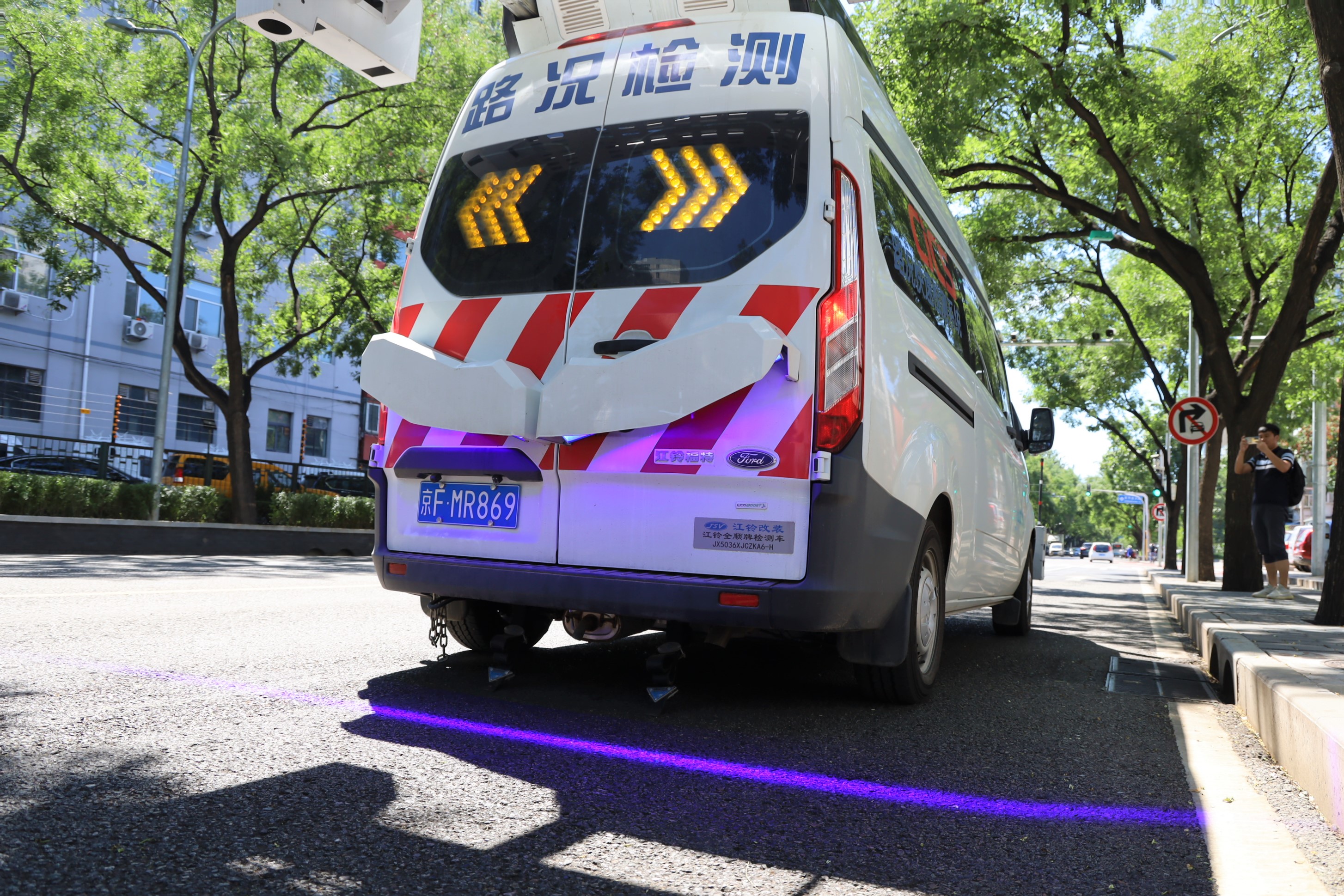 一道神秘的蓝色光线出现在车尾,让这台满满科技感的路检车显得更加炫酷。蓝色灯光采用专利照明技术,解决了路面反光、照明单元寿命短、光源安全性差等普通工程车难以克服的缺点。同时,光线最佳的投射角度,能够突出路面破损病害,使拍摄图像清晰、不变形、不反光,可以精准呈现1mm以上宽度的裂缝,为病害原因分析、结果清晰展示提供质量保证。