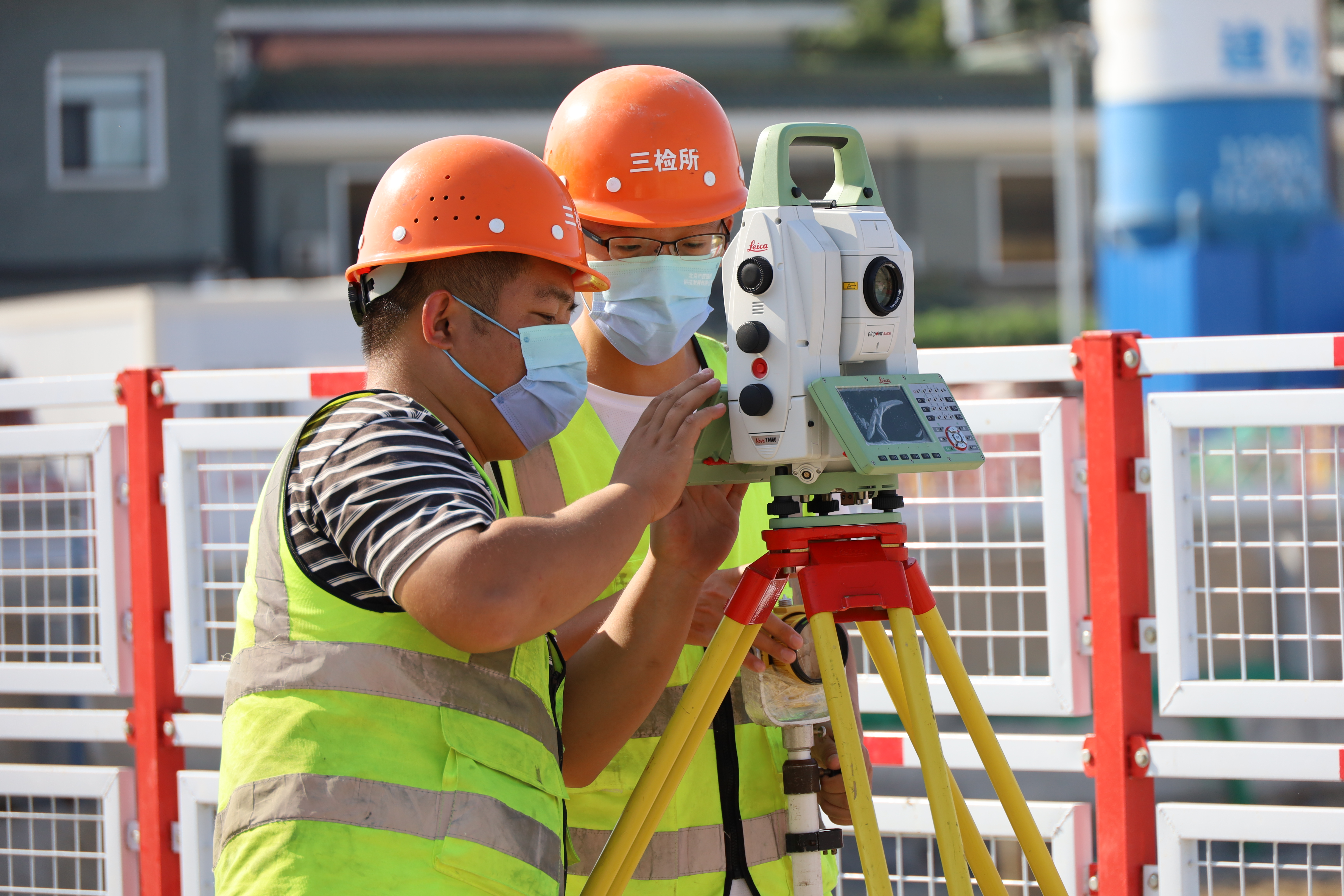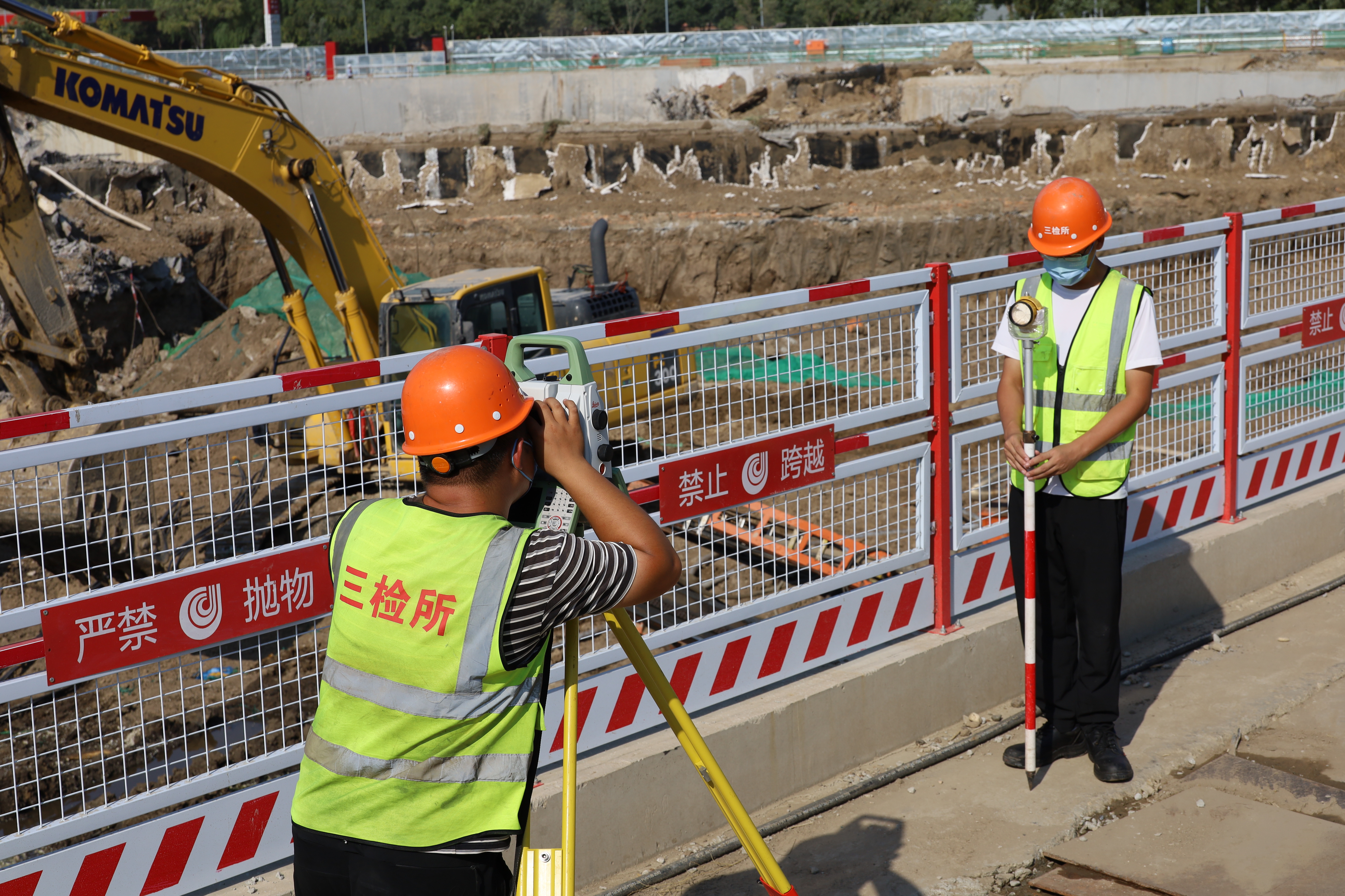 图:工作人员正在使用全站仪进行监测,实时掌握施工期墙体变化情况