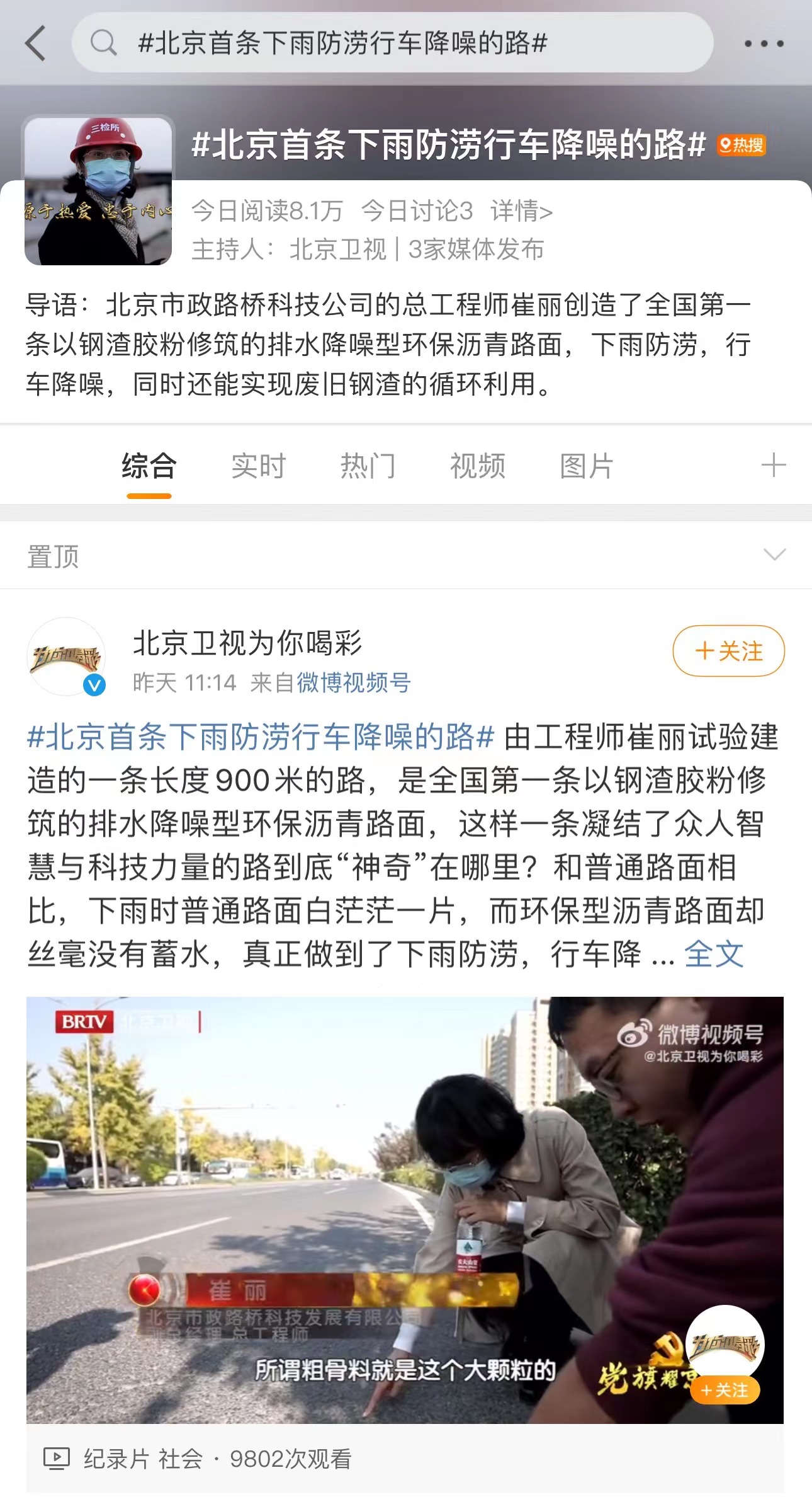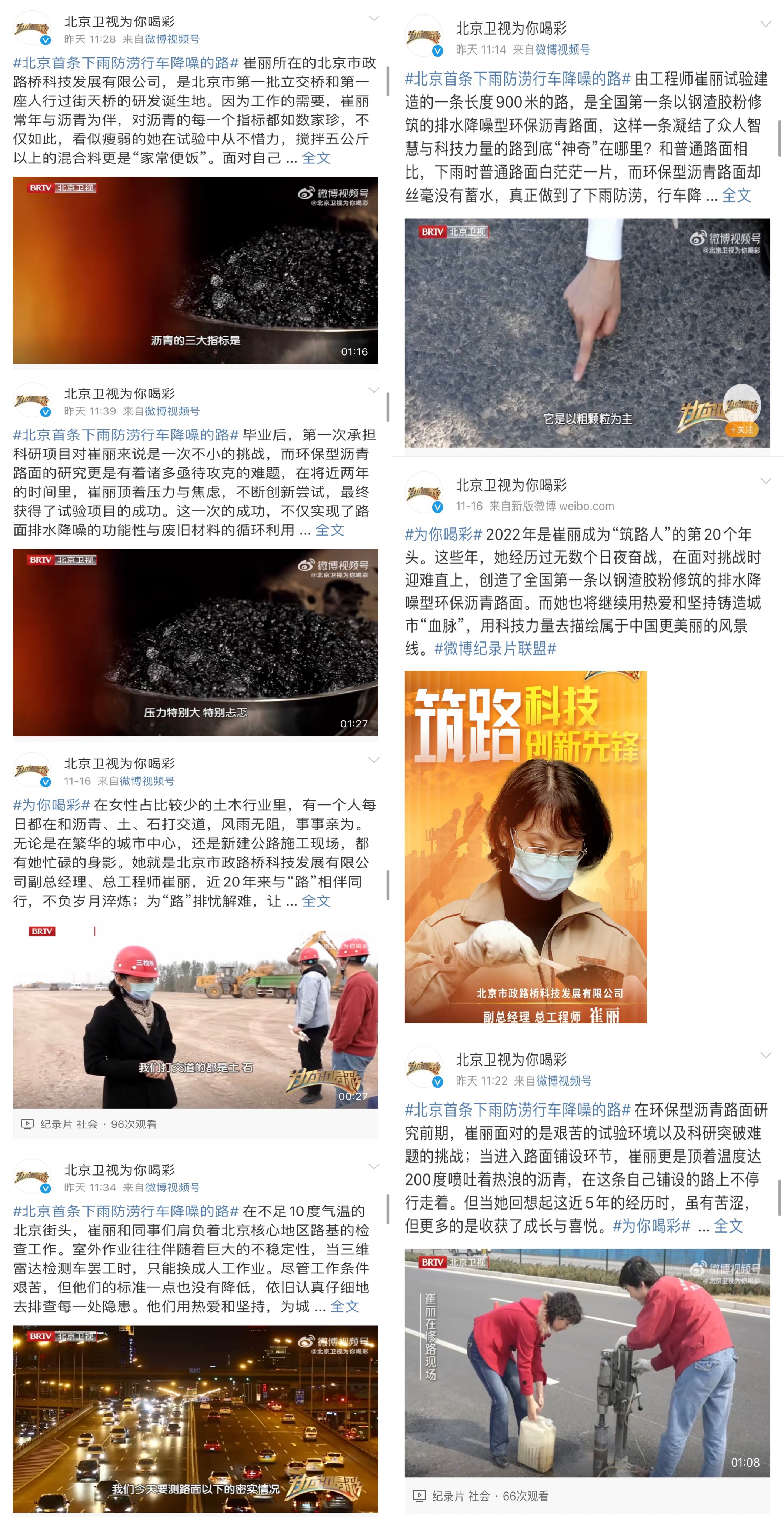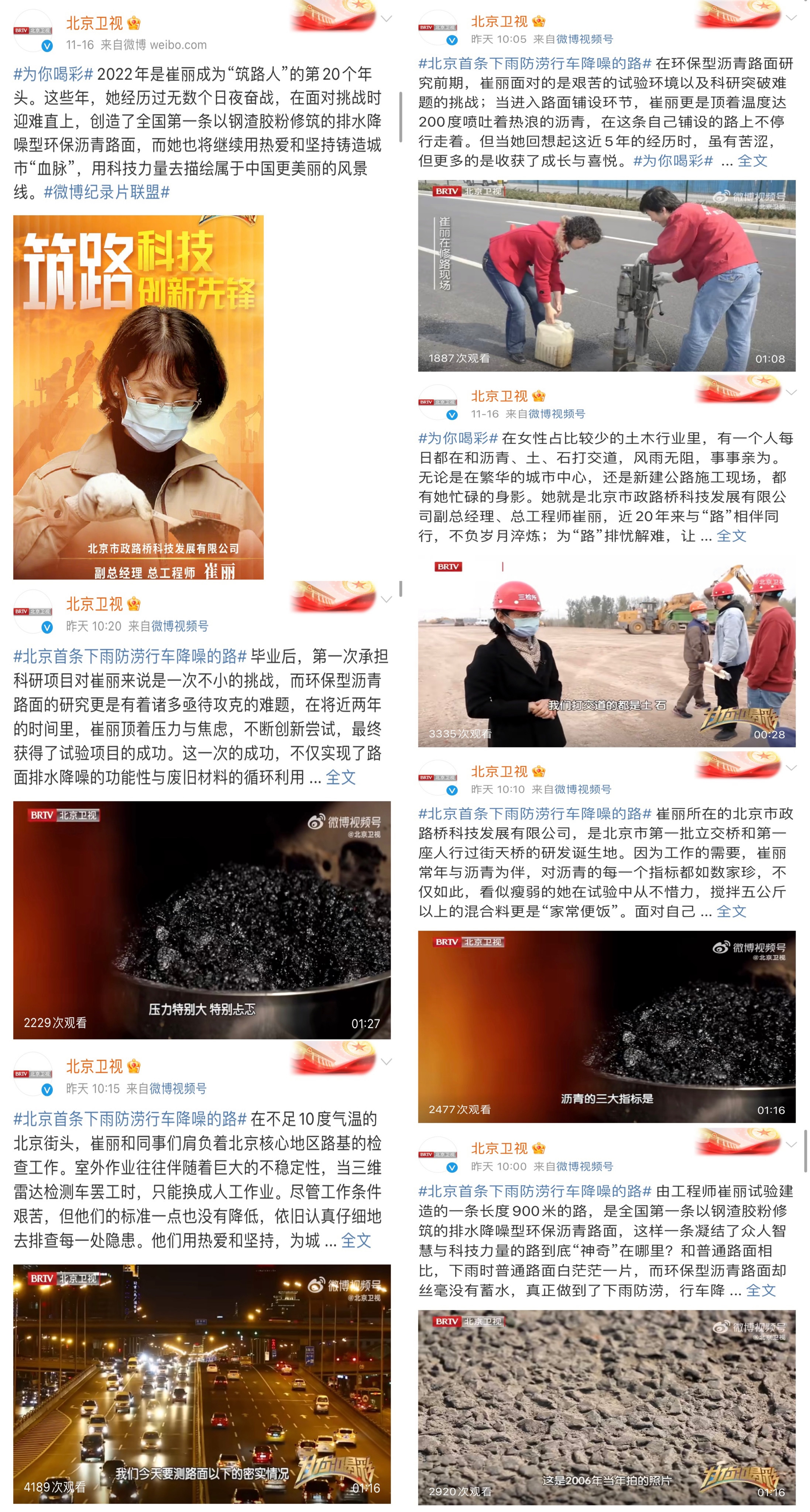 科技创新铸造城市血脉,不忘初心坚守筑路人生。11月16日,北京卫视《为你喝彩》栏目对科技发展公司副总经理、总工程师崔丽进行专访,为大家呈现了道路科技工程师崔丽近20年的科研故事,受到广泛关注。