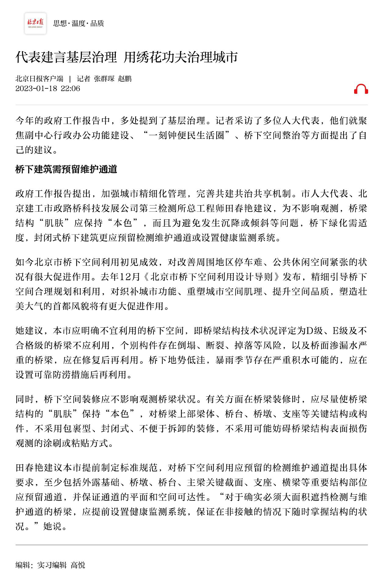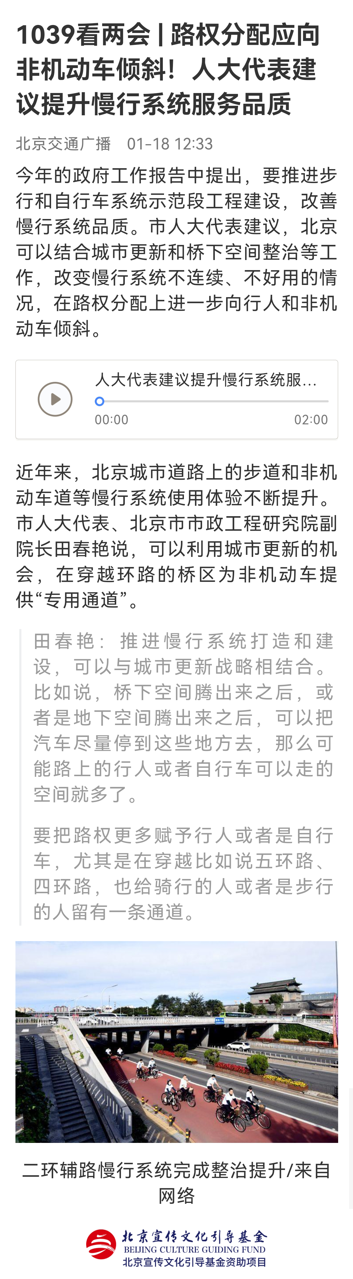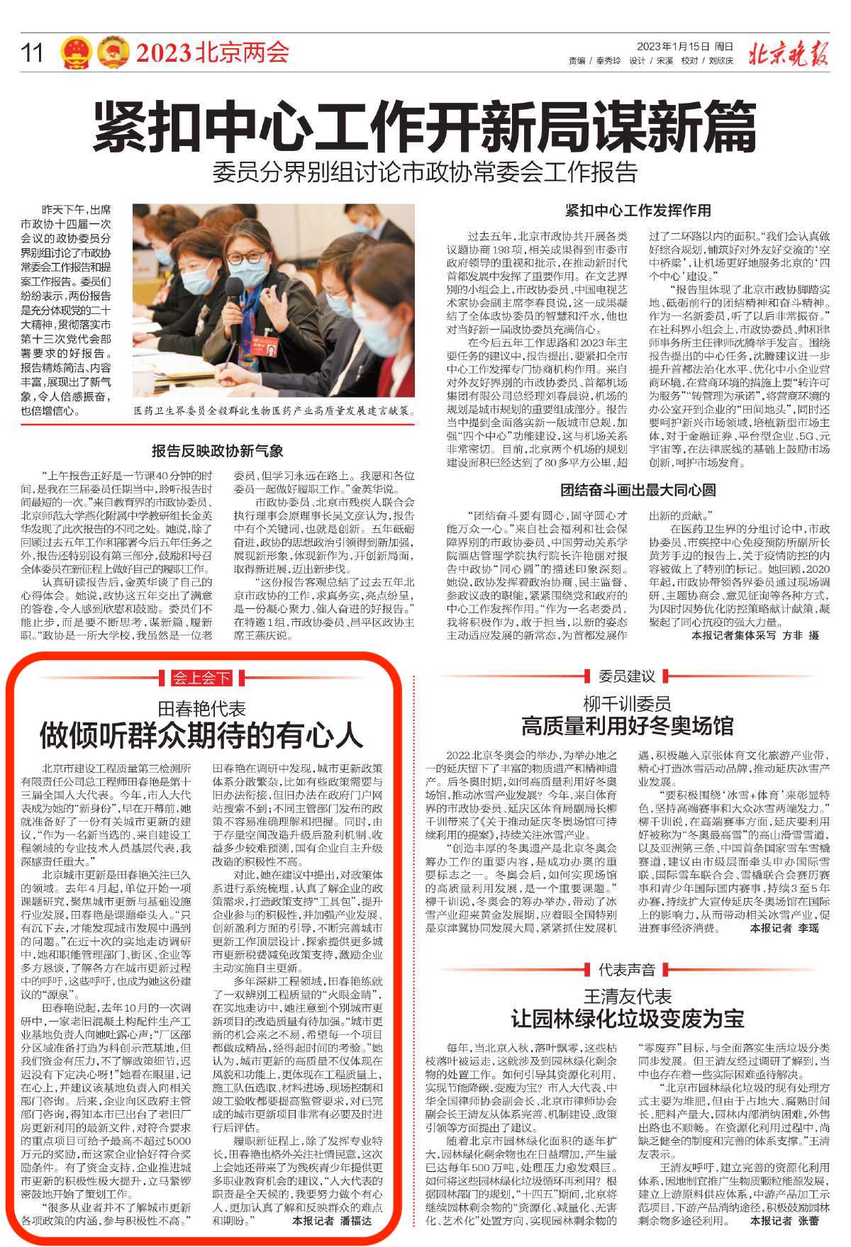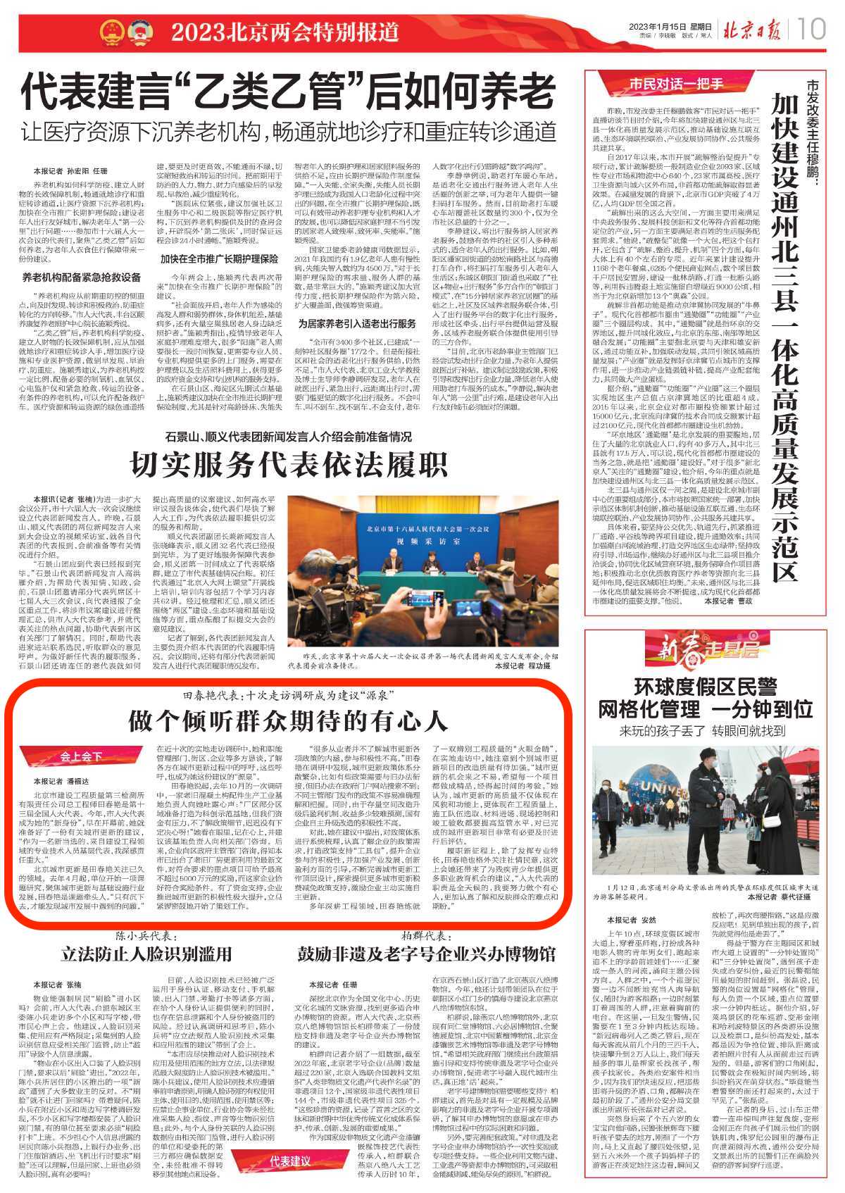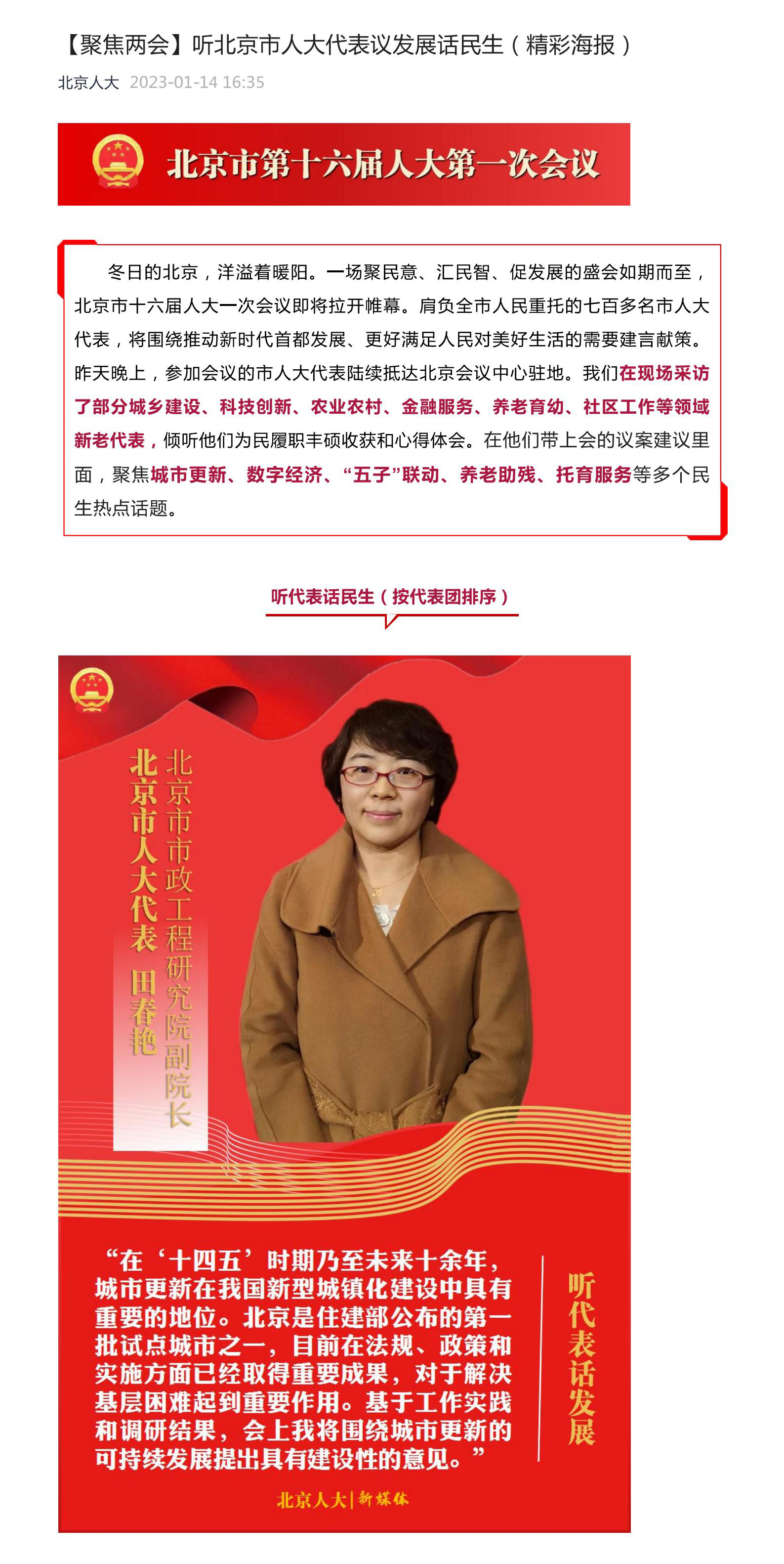 人大代表田春艳通过提交建议提案、参加西城代表团全团会、接受媒体采访等多种方式和渠道积极履职建言,围绕城市更新、桥下空间利用、城市慢行系统提升等方面提出了诸多有益建议,为奋力谱写全面建设社会主义现代化国家的北京篇章贡献力量。