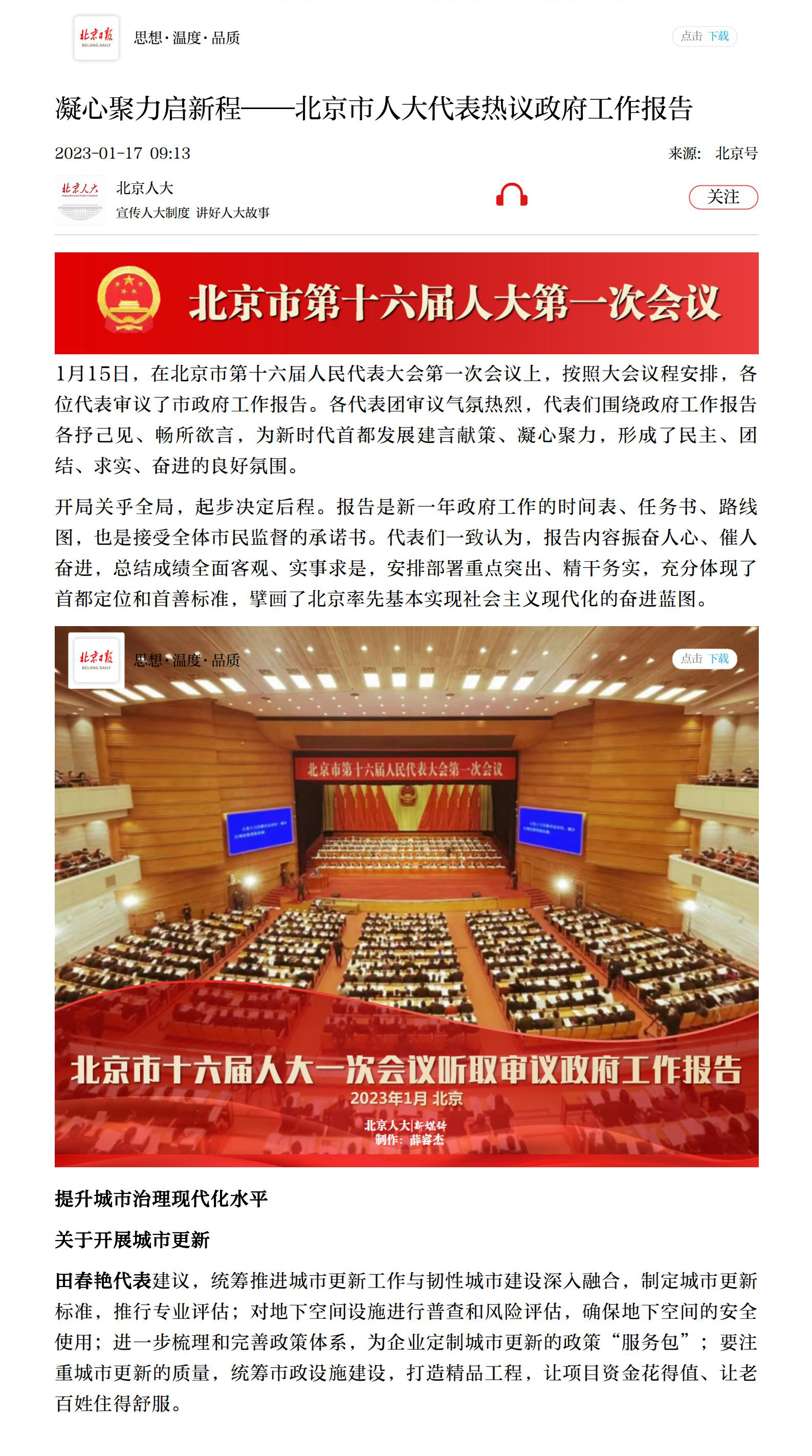 会议期间,田春艳关于城市更新的建议备受关注,她表示,自2020年国家做出实施城市更新行动的部署以来,北京为加快推进城市更新工作,出台了一系列政策文件,形成了一整套制度体系。短短几年间,亲历了城市更新取得的较大进展和成效,并从前沿理论、政策引导、民生诉求等多角度、多维度对城市更新的发展进行思考。会上,田春艳根据工作经历和调研结果,针对推动城市更新工作提出6点建议。未来,她将立足本职工作,积极为民服务,尽职尽责地完成人大代表的使命,努力做人民满意的好代表。