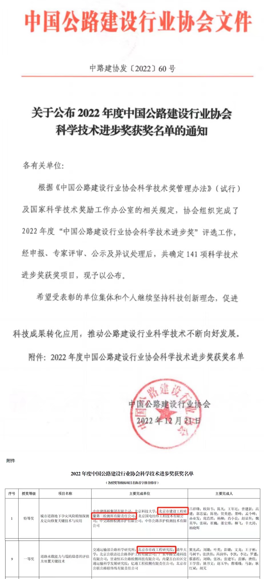 中国公路建设行业协会科学技术进步奖