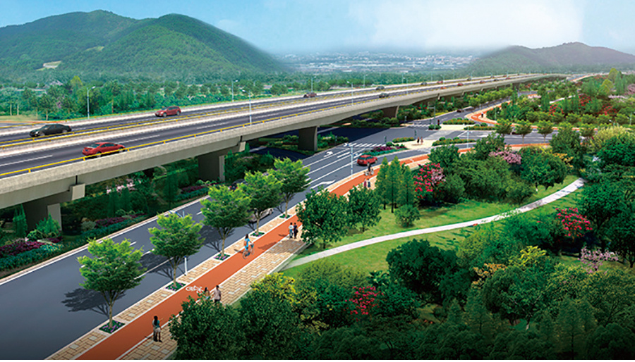 b) 光谷三路跨线桥工程:采用了一些新材料及新工艺,比如钢箱梁安装型控制;现浇箱梁钢、木结合模板加固技术;钢弹体伸缩缝装置;特立尼达湖沥青改性沥青混合料和桥梁外观精细化施工。该项目获得全国金杯示范工程奖。
