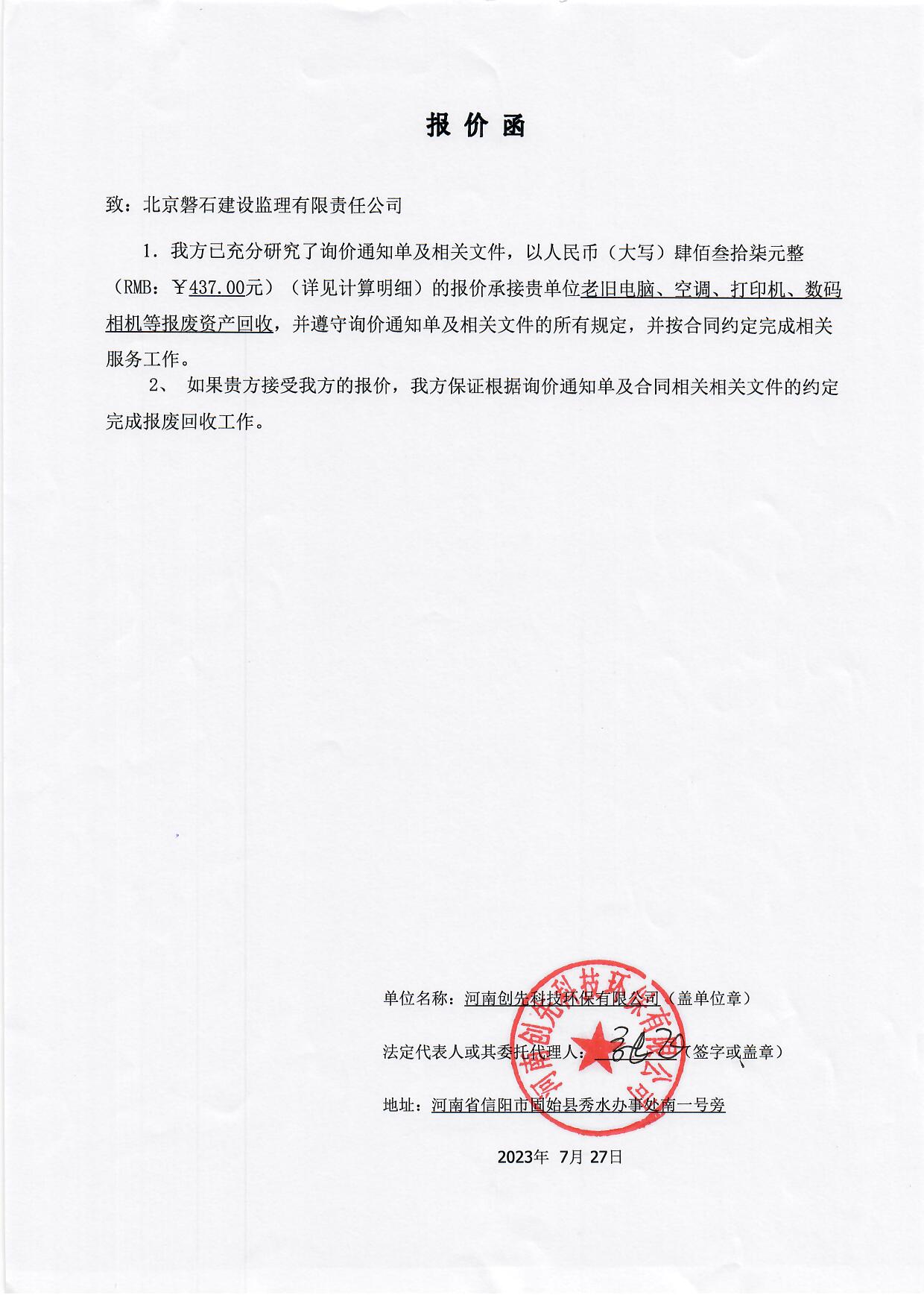 根据现场路勘情况,截至2023年7月27日16时30分,我单位共收到六份报价函,现将北京中源顺达再生资源贸易中心、河南创先科技环保有限公司、北京百物废日物资回收有限公司、北京亿兴源再生资源回收有限公司、北京盛世铭垚环保科技有限公司、河南省金圆废弃资源利用有限公司报价(详见附件1、2、3、4、5、6)予以公示,公示期为2023年7月27日至2023年8月4日。