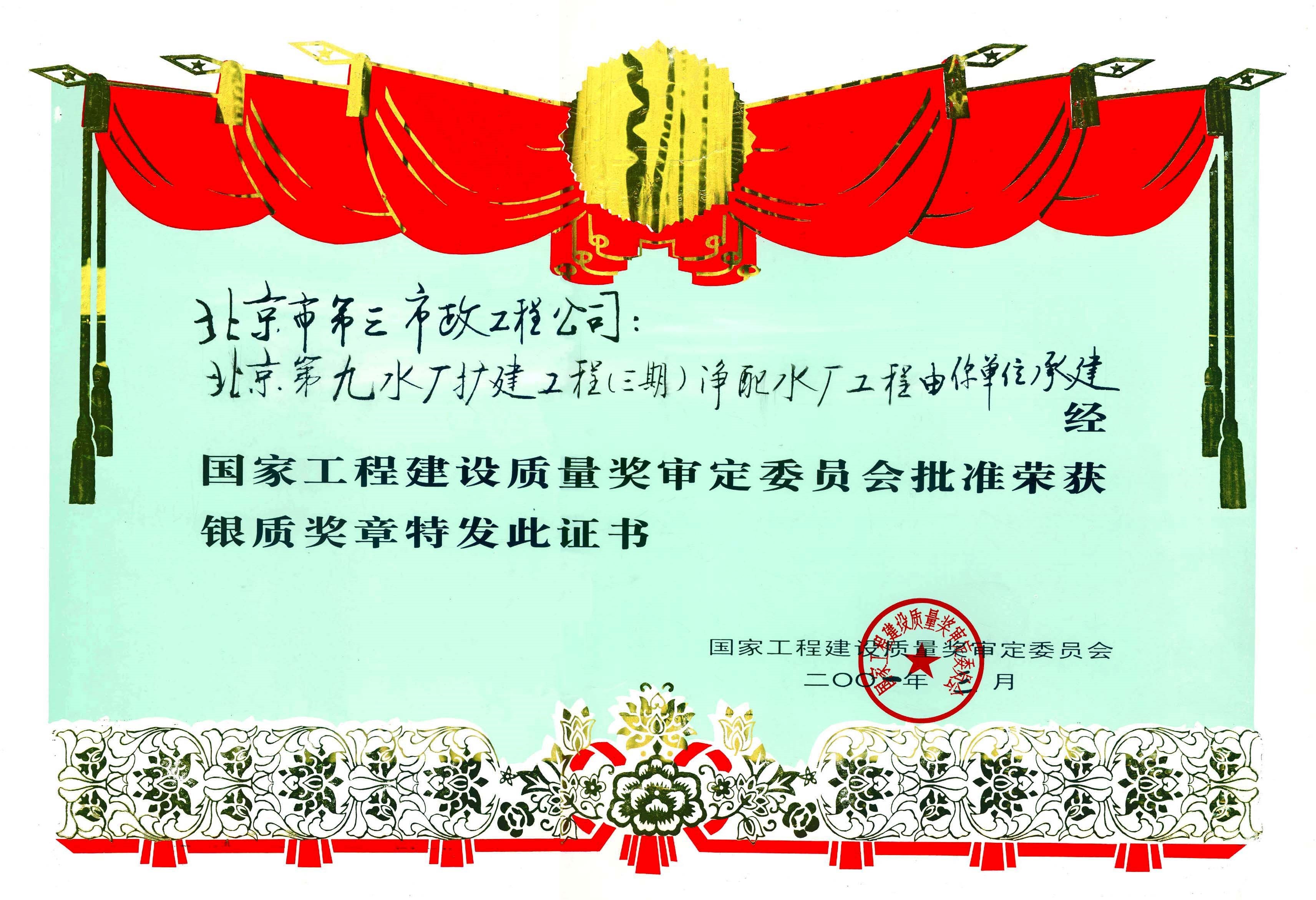 北京第九水厂扩建工程(三期)净配水厂工程经国家工程建设质量奖审定委员会批准荣获银质奖章