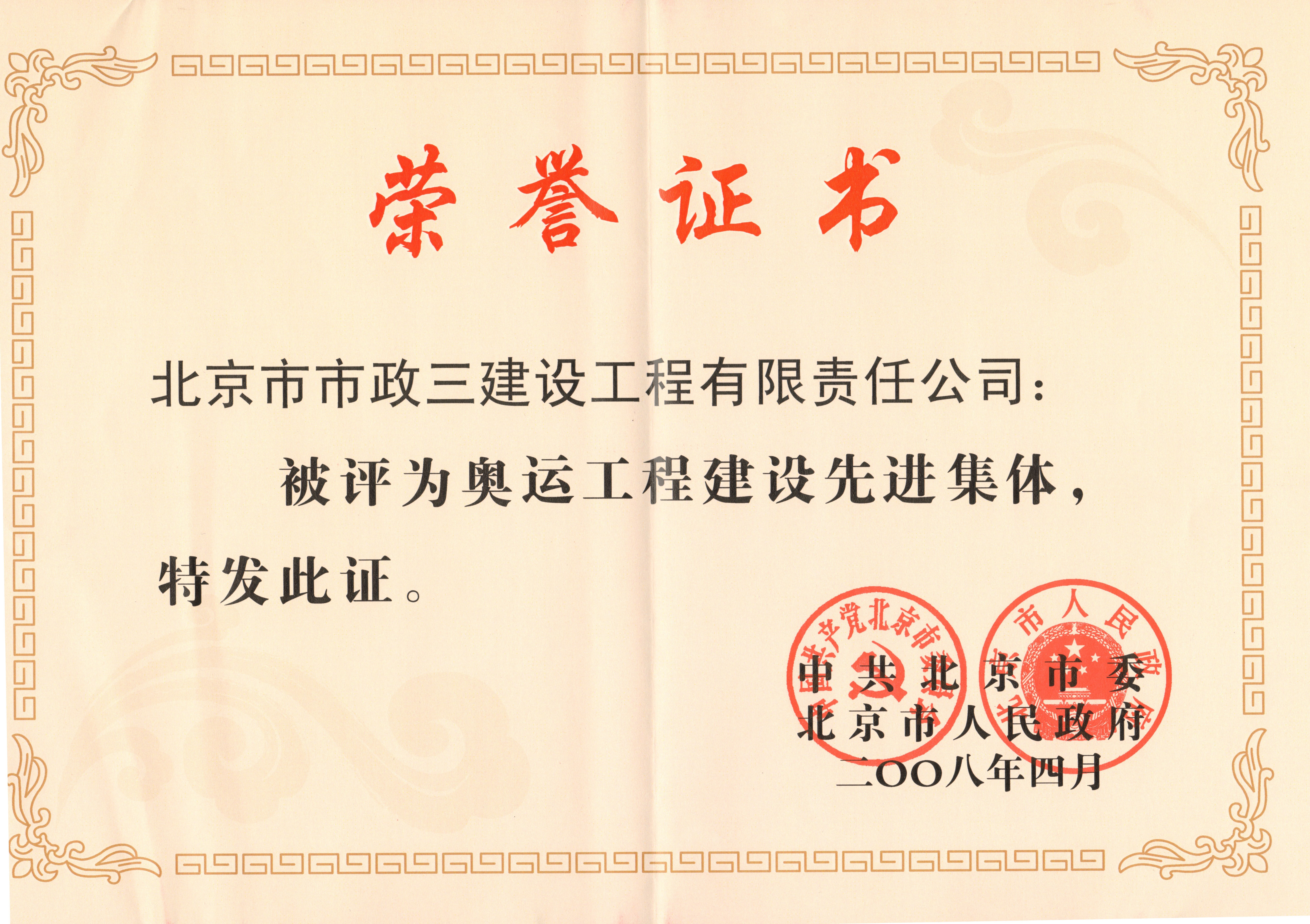北京市市政三建设工程有限责任公司被评为奥运工程建设先进集体