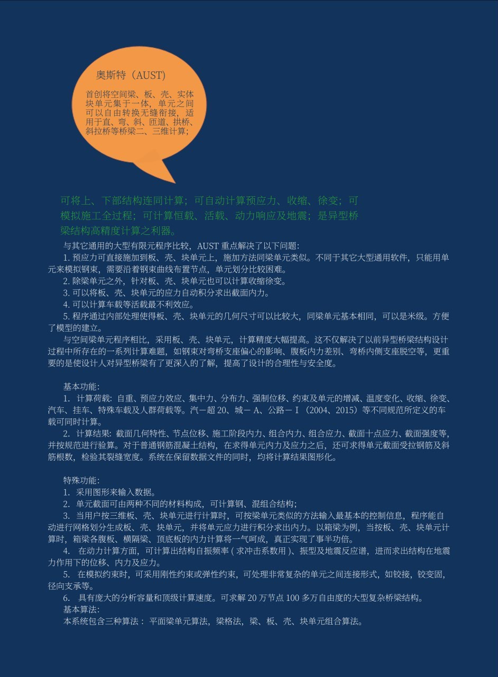 奥斯特(AUST)软件是我公司独立开发的一款功能强大的桥梁结构三维计算分析软件。首创将空间梁、板、壳、实体块单元集于一体。单元之间可以自由转换无缝衔接,适用于直、弯、斜、匝道、拱桥、斜拉桥等桥梁二、三维计算。本系统包含三种算法: 平面梁单元算法,梁格法,梁、板、壳、块单元组合算法。该软件可将上、下部结构连同计算;可自动计算板、壳、块单元的预应力、收缩、徐变,算法同梁单元类似;可模拟施工全过程;可计算恒载、活载、动力响应及地震。是异型桥梁结构高精度计算之利器。