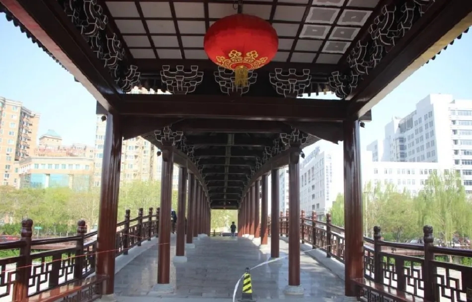 该桥在建筑群中引入一体化设计理念对廊桥立面形象进行了优化:该地区的仿古建筑外立面多为金中都复古造型,在设计天桥外立面时有效利用了这种仿古的建筑形象,确立了以宋代廊桥为主题的外立面总体设计。北京市现有连续梁结构型式的钢结构人行天桥对于小边跨产生的负反力多采用混凝土、钢渣压重、或拉力支座来解决,本天桥利用造型亭子及石材铺装压重来解决小边跨负反力的问题,不但优化了廊桥立面建筑设计,也有效解决了结构的压重需要。