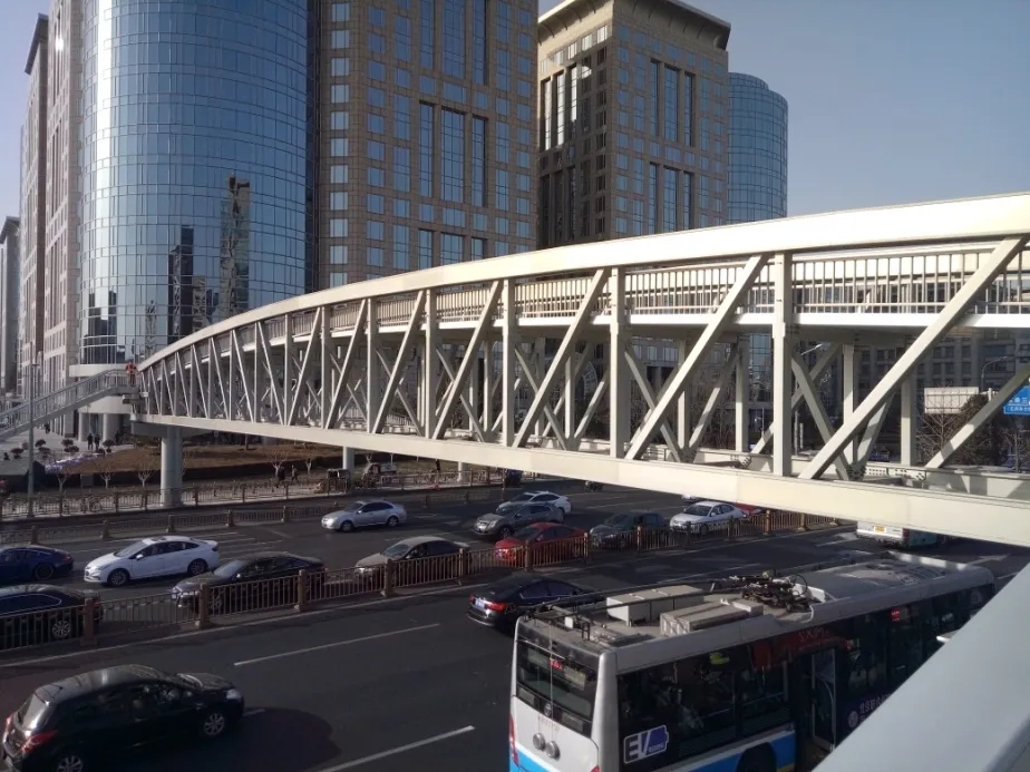 本次改造的天桥采用半开放式的铝合金桁架结构体系,结构简洁明快、视觉通透,现代时尚,它的建成成为展现“现代、人文、时尚、国际化”东单的重要载体。东单地理位置非常特殊,关注点非常高,本次东单路口天桥的结构形式采用了铝合金材质,做到全寿命期间免防腐涂刷,同时全装配化,夜里吊装,凌晨放行,对现场交通影响极小;本桥跨度创国内之最,单跨跨度达到52米,已建成的铝合金桥梁跨度多为30米左右,大跨铝合金桥国内无现成的设计与施工经验,既有型材形式无法满足本工程的要求,本桥在国内首次提出了U型型材的设计思路,为大跨甚至超大跨铝合金桥梁的应用及推广提供了技术上的可能。首次在大跨铝合金桥梁中采用内卡式TLMD高灵敏小阻尼器解决了大跨铝合金天桥的使用舒适度问题;该桥的各项技术指标在国内居领先地位。