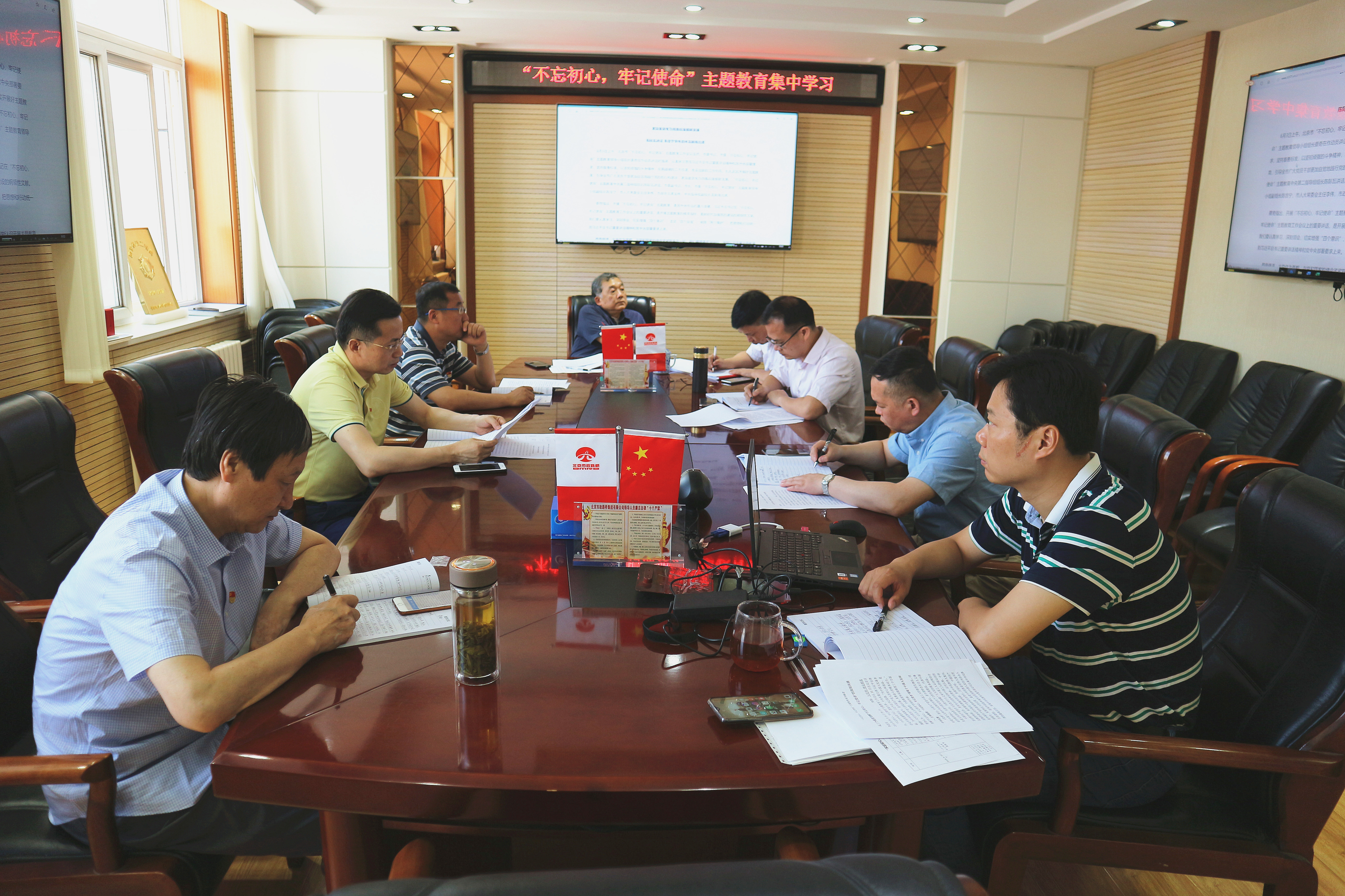 北京市市政专业设计院股份公司3楼会议室内,学习研讨氛围十分浓厚。紧扣学习主题,紧密联系思想工作实际,公司领导们围坐一堂,领学领读,谈认识讲体会,认真地做着笔记……